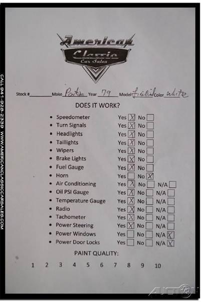 Very clean and original 3 owner car from Florida. It has only 77k actual miles and looks as clean as a low mileage car should. The sheet metal is straight and free of rust and the paint has been refinished in the original shade of Cameo white. The paint is excellent with lots of depth and shine. The interior is clean and original as one would expect on a low mileage car. It is 36 years old and looks much nicer than most original cars from this era. The cloth seats have held up nicely due to minimal use and the carpets, oor panels, tc. are in good shape. Dash has a couple of minor stress cracks and no other issues. The wheels are the original large turbine style and are in good shape. The glass is all very good as well. The under carriage is solid and clean after wiping and dusting some older road residue. No patches or other issues and it has a Flow Master exhaust that sounds nice. Not a 100 point show car, ut an original and VERY nice car after 36 years. No Rust! Call 941-928-2339 wwww.americanclassiccarsales.com