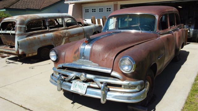There are two Pontica wagons, 53' & 54'. The price for both (it's a package deal) is $5,000 totally firm so don't even suggest another offer. But there is a one time special before my wife get home from her trip. I have Thursday and Friday and would settle for $4,000 to have them gone right away if someone was able to pick them up that quick. Otherwise I will sit on them longer and hold out for the $5,000. The 54' has been in my family and spent most of it's time in Arizona until the last 20 years. Not structural rust to worry about. My aunt that first owned it is now 92. The grey 54 looks bad but it was stripped before being put into storage and ruined by the storage people. The engine, transmission and breaks were rebuilt before I had to put it into storage. I have everything including head liner wires. The trim is a complete set for a Star Chieftain (yes there is variations, straight line all the way along the side), I have all the chrome,rear wheel cover, hub caps, window cranks, on and on, everything. Plus red vinyl reupholstered seats. All the parts for the 54 are in the rafters of my garage (photo unavailable). All windows are accounted for be a couples are cracked including the front window. It has a California title. Photos of the dissembly can be provided if desired and the Pontiac factory maintenance book and 54 Chiltons guide. The 53 is as you see it. Hauled in from Montana. Without this car you can't build on the good 54 frame and suspension etc. The bolts that hold the hood on the 53 are loose so I can't open it alone to get a picture of the engine. It is 100% original in there. The hauler didn't know the air filler was full of oil and it dumped onto the car below. What a mess it was. The chrome on the 53 is also very nice so as the bodies are the same you could build either car and sell the others parts. In the picture of the reupholstered seats the folding back rest and bench seat are sitting on the front seat bench with attached back rest. It is the foundation Jenga piece to the storage unit so I'm not going to pull it out until it is time to close the deal. My plan was a body of transplant onto the 54 frame and use the best fenders and doors between the two to complete it. Both cars must go. |