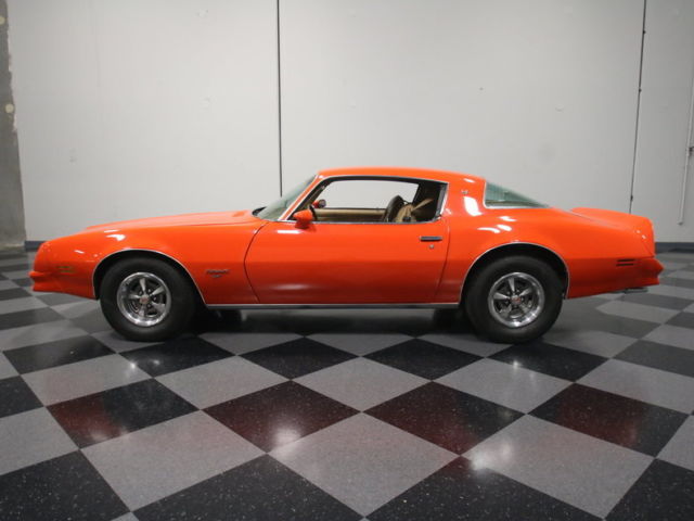 Pontiac was still in the performance business when this 1976 Pontiac Firebird was built, complete with a 350 cubic inch V8, making it as much fun to drive as it is to look at. The market is moving on these cars, and this high-visibility example still attracts attention everywhere it goes.Recently repainted a vivid shade of bright orange that sure looks like traditional Carousel Red, this Firebird is exactly the opposite of subtle. Forget all the jokes about flying chickens on the hood, because this one has a clean, chiseled look that suggests horsepower without the added graphics. It was apparently a clean, honest car before the repaint, too, and has ended up as an ultra-sharp reminder of what performance was like in the '70s. Gaps are good all around, and Pontiac gave it a great look with a modestly aggressive front bumper, a set of Formula badges, and a ducktail spoiler out back, all of which remain in excellent shape. The paint is two-stage urethane, so it has a great shine that's virtually indestructible, and the shiny trim along the lower edges emphasizes the length of the car, making it long and low. It's not perfect, of course, but it's got an awesome look that'll stand out among all the Trans Ams you see at shows.Tan buckets were the best way to travel in 1976, and the classic color combination ensures that this Poncho will always be in demand by collectors. The seats are comfortable and supportive thanks to firm foam underneath, and the seat covers themselves are nice reproductions that show very little wear since the restoration. The center console houses the original shifter for the TH350 3-speed automatic transmission as well as a handy storage bin, and the gauges look quite good considering their age. The original AM radio is gone, replaced by an AM/FM/cassette head unit, but the factory 8-trcack is still hanging underneath. Other options include factory A/C (needs service) and power windows. The trunk is in nice shape with a reproduction mat and a vintage-looking spare tire with jack assembly.While a lot of engines were down on horsepower in the mid-70s, Pontiac engineers were better than most at keeping their top engines at the top of the horsepower charts, and the 350 cubic inch V8 in this Firebird is a good runner. Thanks to proper maintenance and minimal modifications, it runs great, so it's ready to enjoy without worries. It wears Pontiac Turquoise paint, a Rochester 4-barrel under the original air cleaner, and a brand new dual exhaust system that probably adds a few horsepower. The chassis is in fantastic condition with shiny black floors and a new gas tank, and a set of reasonable gears in back make it an effortless cruiser. Wheels are the traditional Pontiac Rally IIs which wear 235/70/15 blackwall radials at all four corners.Five years ago, we told you that this day was coming, and now it's here. '70s Firebirds are red hot and climbing the market faster than almost anything else. Don't wait another day, call us now!