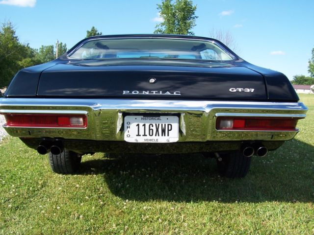 1971 1/2 Pontiac GT-37.Car underwent a full restoration in 2013.There were only 5015 made in 1971 with the 350-2 barrel engine.Pontiac Engineering believes this was the only one built in Starlight Black(code 19)with Ivory(code 232) interior.Restoration included new fenders and quarter panels,all new interior,motor and transmission rebuilt as well as new gas tank,brakes and all lines.The Rally 2 wheels were professionally powder coated.All matching #'s car.The only things that are not matching are the rear end and now has power steering.Rear gear is now a 3.36 posi.The original 2.56 posi comes with the car as well as all original emblems and the manual steering unit.Mileage of 71,000 is correct.Original AM radio.Car drives and runs perfect.Has a small transmission drip if the car sets for a long time.Dash has a very small crack below the passenger side vent.Car is laser straight.1st place winner at Ames Performance Pontiac Nationals in 2016.If you want a car that nobody else has,this is the car for you.Call or text Brent at 419-606-2490 with any questions.I reserve the right to end auction at any time as the car is for sale locally.