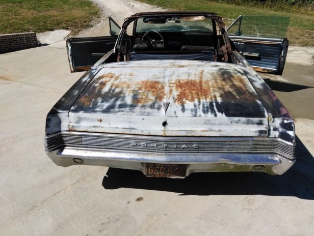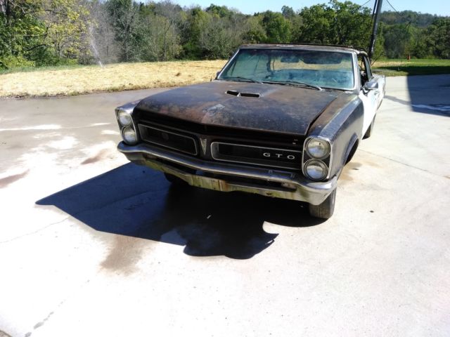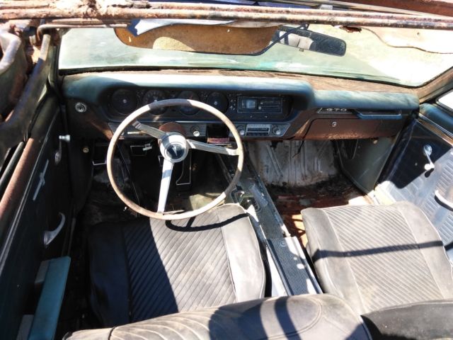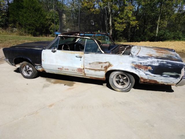 This is a project 1965 GTO convertible tripower 4 speed. I have the PHS documentation to show how it was born. I found this car out in the hills under a lot of trees and I had to cut it out. The car had been stored with a heavy tarp over it, but over many years, water worked it's way through in a couple spots. The frame and the glass are good, along with the convertible framework also. The floor pans and trunk pan need replacement. The body panels aren't too bad but do need some patch panels in certain areas. Water ran through under the front windshield and the lower part of the dashboard is rusted out also. The original M20 transmission is still in the car but the engine is gone. I found the original radiator, bell housing, emblems, etc in the trunk. A very restorable car but does have plenty of rust. These are harder and harder to find.