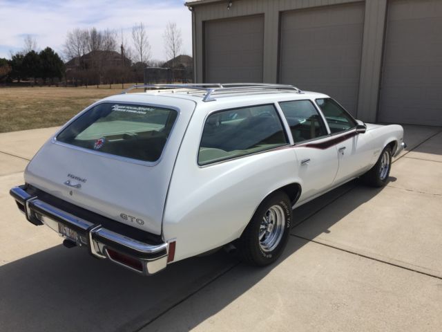 Here is my 1973 Lemans Safari 6 passenger GTO cloned wagon. The car runs and drives great that I would trust to drive anywhere. This is a solid Arizona wagon that I have owned since 2011 and have put over 10K miles on it. I bought the car as a driver, but in 2013 I stripped most of the car to bare metal and had the car repainted factory GM white with a pearl clear coat. During the reassembly I replaced the windshield, all the the weather stripping with reproduction or NOS parts, replaced the rear bumper with a re-chromed piece, replaced the original roof rack with an NOS rack, found a new a/c condenser and re-charged the a/c, and added Phoenix Graphics 1973 GTO stripe kit. For the interior I had the front seat reupholstered, added a new carpet, reproduction floor mats, repainted or dyed all interior panels, added a Retro Sound radio, and repainted the dash (signed by Arnie Beswick). The interior looks great, but does have some cracks in the original dash pad (had repaired but still visible - see pics), and there is a small tear in the headliner in the very back plus a tear in the passenger front visor (not very noticeable). The car was a 350 V8 a/c car, but the previous owner installed a 1968 Catalina 330 hp 400 c.i. that runs great with a TH400 that shifts as it should. The car has its original heavy duty open rear end and a GTO rear sway bar. Since I have owned it I have replaced the front shocks, idler arm, Hi Jacker rear air shocks, light duty Reese trailer hitch (have not pulled anything yet), tune up items, added Magna Flow polished stainless mufflers, and much more. The new BF Goodrich tires were added to the Cragar SS wheels. I have a set of 1973 GTO steel wheels on Tiger Paw tires with correct poverty caps that go with car. The paint shows good, but has a few scratches in the passenger rear quarter, one on the front passenger fender, and one on the rear drivers quarter thanks to my kids bikes. The car is almost rust free, but has a few bubbles behind the rear doors (see pics) and a few in the lower rear lip of the quarters. The rest of the body and underneath show no signs of rust. I have brochures and the PHS documentation showing the car was sold from Mecham Pontiac in 1973 (home of the Macho Trans Am's in the 70's). Everything on the car works as it should and is very dependable for a 45 year old car. I have driven the car in a few legs of the 2014 & 2015 Hot Rod Power Tour and to many Pontiac events, the car always draws a crowd. The ONLY reason for considering to sell is to finish my 1969 GTO pro street build. I am sure I am missing some things, but if you have any ?? let me know, thank you for looking!