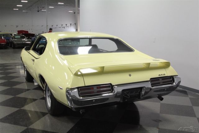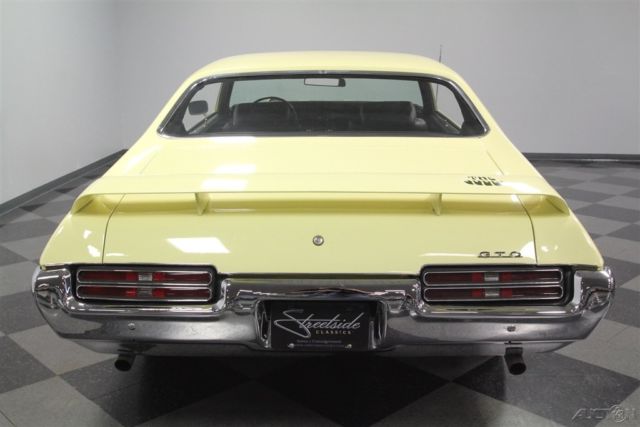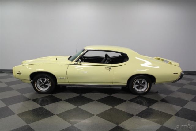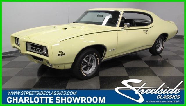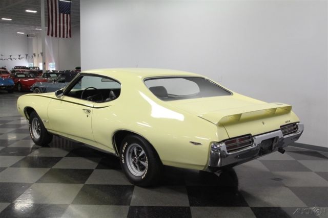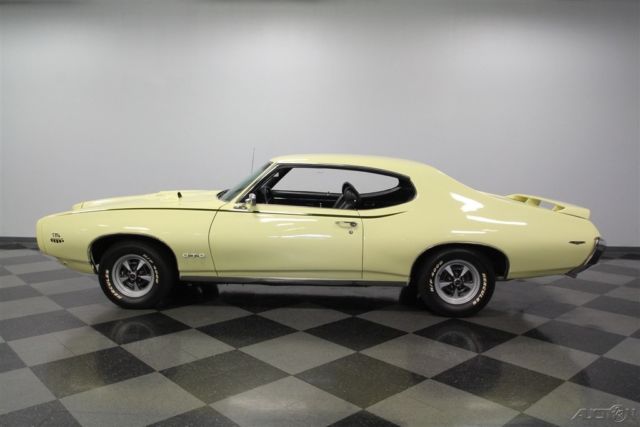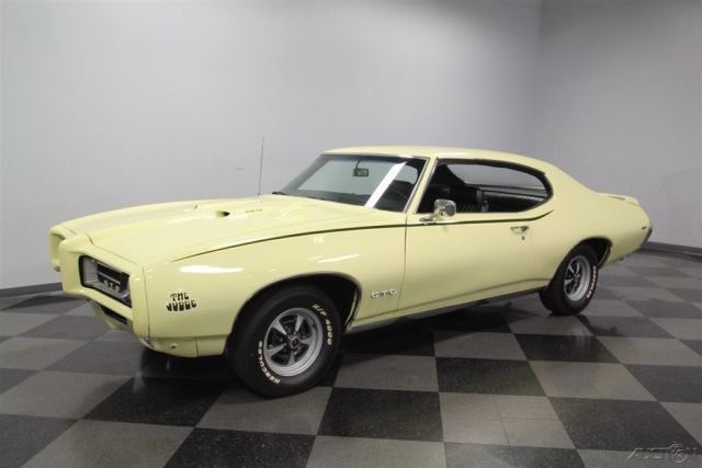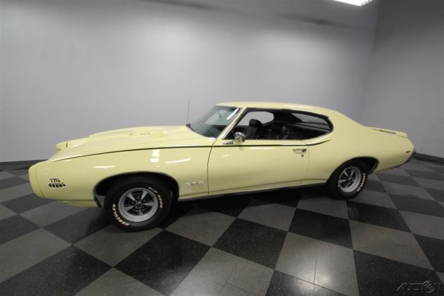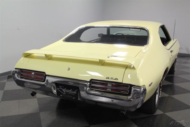 We can tell there was a lot invested in making this 1969 Pontiac GTO Judge look so good. Restored to correct colors and retaining its and the original 400ci V8 and four-speed, it's handsome, fast, comfortable, and intimidating... all the elements that make the GTO a timeless legend. The subtle Mayfair Maize on this hardtop gives it sophisticated first impression. This factory-correct color was expertly re-applied during the coupe's frame-off restoration to give it an amazingly deep shine. The body panels remain straight; the form-fitting rear chrome bumper is mirror-like; and the Endura front bumper continues to look correct & color-matched. So it's a terrific total package that holds up to the extra scrutiny. In fact, this one really is for those who love up-close details. For example, this real-deal Judge's stripe package looks distinctive in black from a distance. But as you get closer, detail oriented people will marvel at the white and yellow outline that makes the black really pop even more. More than just a distinct package, a powerful GTO like this has all the right intimidating pieces. The Ram Air hood scoops, large rear spoiler, and Rally II wheels with the PMD (Pontiac Motor Division) center cap reminds everyone that this Judge rules the streets. The factory-correct black bucket seat interior is quite inviting with nicely detailed seat covers that showcase the always-interesting Pontiac design motif. Plus, the wood grain paneling on the dash furthers this upscale feeling. This restored classic is meant to feel like a time machine, so even the AM radio is still cranking out tunes! You get the Pontiac three-spoke steering wheel, and just ahead of that is a tri-pod round gauge design with the speedometer prominently in the middle. Are you looking for the tach? It's out on the hood for a classic element that also provides a true head-up experience. And that goes particularly well with the Hurst T-handle shifter. One look at the 400-cubic inch V8, and you're again reminded this GTO is all about honesty and originality. It wears the correct Pontiac Turquoise paint with pride, and it sports a chrome valve covers (after all, Pontiac knew its customers would be showing off their engine bay.) Even the diaphragm around the Ram Air intake looks crisp. Best of all, this 1969-correct WS block is the original motor. It inhales deeply through a four-barrel carburetor, and the sweet rumble of the dual exhaust let's everyone know you have serious power under the hood. You have complete control over this powerhouse and its soundtrack thanks to the original Muncie four-speed manual transmission. As you pour though all the details, you're going find components that come up year-correct - and likely original. This includes everything from the heads on the motor, to the rear end. And so the result is a clean and detailed restored package that has a real eye for originality. The sale come complete with restoration photos, owner's manual, and Pontiac Historic Services (PHS) paperwork. Such a well-assembled package is surely to win awards and surely won't stay around here long. Call today!!!