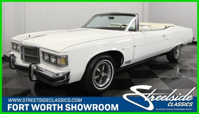 If you want a full-sized '70s luxury cruiser, this 1975 Pontiac Grand Ville convertible delivers all the right ingredients. First, it's a big old ragtop, and nothing says you've arrived like a '70s convertible. Then there's the thumping 455 cubic inch V8, a ton of power options, and beautiful white paint. Yeah, this sucker was built to cruise. It's hard to tell if the paint is a fantastically well-preserved original paint job or something done a few years ago, but does it really matter? It looks great, and while it doesn't jump up and hit you in the nose, it does give the Grand Ville an upscale and custom look. Our photos don't show it off like the sunlight does, but you can clearly see that the bodywork is straight and clean, and as a product of the '70s, finding a rust-free example is paramount. Pontiac didn't get hung up with excessive trim, so it has a clean, chiseled look that makes it seem almost sporty, which was surely the intention. Pontiac's split grille is present in a token way up front, and that long hood almost has its own horizon when viewed from the driver's seat; good thing there's a hood ornament out there for navigation. Nice chrome bumpers, sport mirrors, and full-width taillights add interest, and all the original badges remain in place so there's no mistaking this car for anything else. Pontiac nailed it with the interior, which features diamond-pattern seats that are the ultimate in '70s cool. With room for six, this full-size cruiser doesn't skimp on luxury and delivers that unbeatable combination of cushy ride and vast interior space that makes it the ultimate road trip ride. Wood paneling on the dash is somewhat convincing, and the layout gives the driver fingertip access to things like the ice cold A/C, cruise control, and the AM/FM/8-track radio in the dash. Other options include power windows and locks, a tilt wheel, and a power front seat, all of which make this car a top-of-the-line piece from GM's excitement division. The new white convertible top is power actuated as well, and features a glass rear window that makes it feel a lot more isolated inside. The big trunk is ready for your next road trip, and includes a full-sized spare and original jack assembly. Pontiac's 455 cubic inch V8 really needs no introduction. Renowned for its torque production, it gives the Grand Ville an effortless style that eats up the miles without breaking a sweat and pulls the luxurious convertible around with a great V8 soundtrack. Nicely maintained and quite correct with a lot of factory components, the engine bay offers additional evidence that this car has led a good life and has had a good amount of money invested in it recently. There's a recent alternator, the A/C has been serviced, and a fresh master cylinder helps keep the brakes working their best. It's backed by a TH400 3-speed automatic transmission, and on a car this big, power steering and brakes were, of course, standard equipment. The unparalleled ride quality is something that needs to be experienced to be believed, and it soaks up bumps like an ocean liner. Classic Pontiac Rally II wheels are fitted big 235/75/15 whitewall radials, which look exactly right. We'll never see full-sized luxury cars like this, and certainly not convertibles. With tons of personality and luxury, this Pontiac is still a first-class way to travel. Call today!