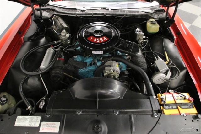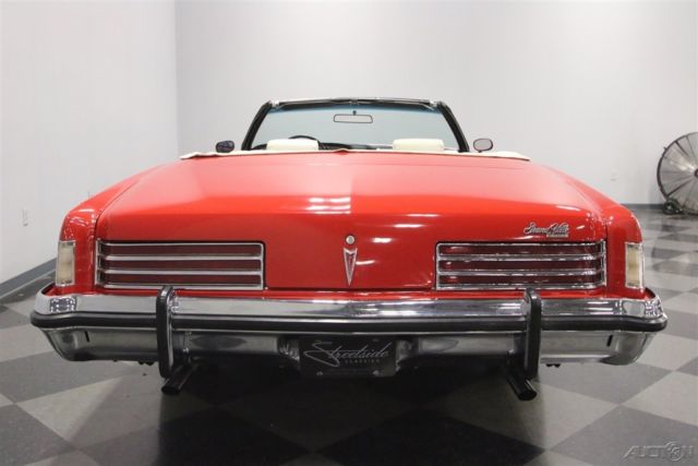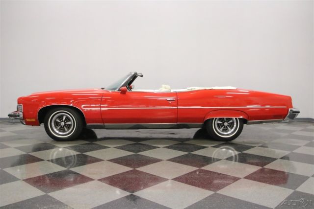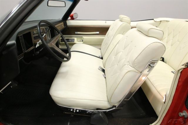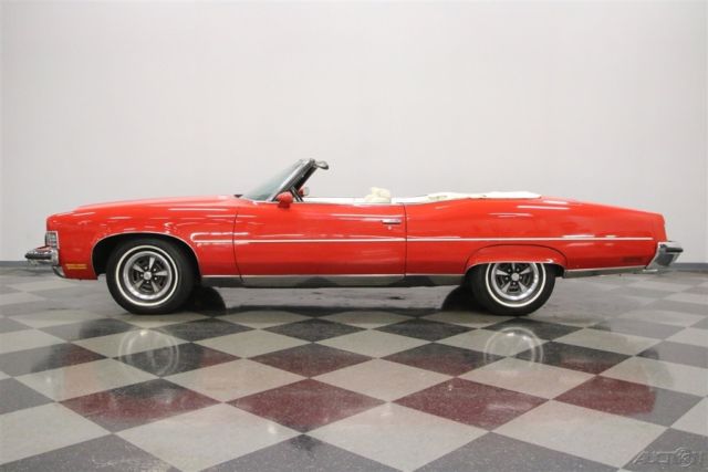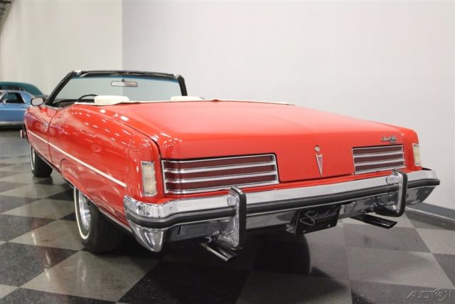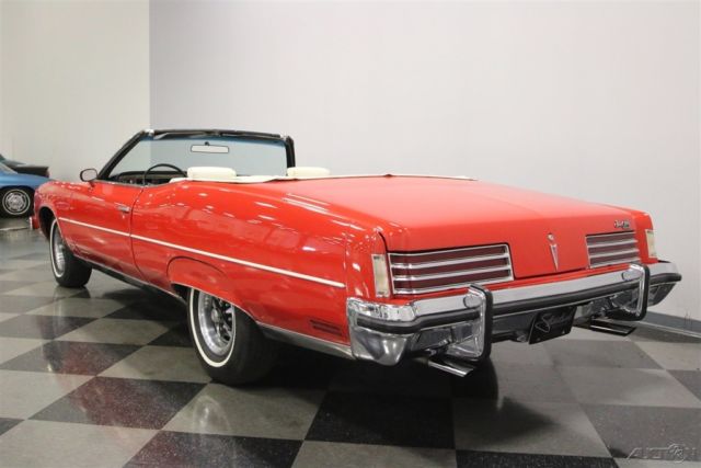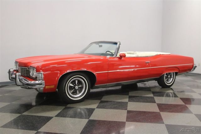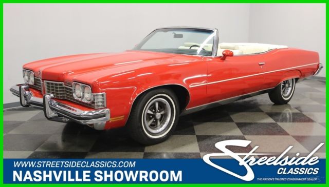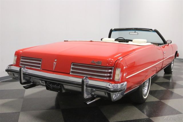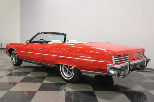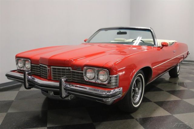 Summer may be drawing to an end, but that means that fall is just around the corner. And what better kind of car is there to head out and enjoy the fall colors in than a really cool 1970s convertible? This beautiful and comfortable '70s cruiser is a really neat find and could be yours. Come on down and check it out. The Grand Ville was the top of the line Pontiac in '73. It focused on offering plenty of room with plenty of luxury. It was also the only full-sized convertible offering from Pontiac in the late seventies, but demand was low, so it is also rare with production never topping 5000 per year. Red and White has always been a great color combination for a convertible and this luxury cruiser offers acres of both. The paint shines brightly reflecting lights off its long lines and gentle curves. Up front a massive chrome bumper leads the way underlining a split grill with a Pontiac Arrow in the center. The hood extends out over the center of the grill and there are dual headlights on each side. A thin line of body side molding runs front to rear and chrome dresses out the rocker panels. Wheel spats dress out the rear fender wells and bold, three bar taillights are underlined by another sharp looking bumper with a couple chrome exhaust tips peeking out from underneath it at the rear. Open that single, very long door, and you will find an interior as comfortable as your living room at home. The door panel itself is dressed in white, trimmed with delicate chrome piping, with a sculpted brown panel surrounding the door pull and power window and lock switches at your fingertips. The power front seat is luxuriously upholstered with a white button tufted back and a pleated bottom. The couch, I mean seat, in the back is just as impressive, and they both have a crest embossed in the center of them. There is a three spoke steering wheel mounted on a tilt column with cruise control. The dash board is a wood grained affair with the speedometer and gauge cluster in the center, the power roof switch along with the wipers and lights on the left, and radio and ventilation controls, including those for the A/C on the right. When the roof is down there is a nice matching white boot to cover it with. Underneath the hood you will find the original and powerful 455 cubic inch engine nicely dressed out and nestled down in a neat and clean engine bay. It runs strong and can motivate this big car down the road in a hurry if you ask it to. A stock black air filter assembly with a sticker announcing the big block engine sits on top of the only modification to this motor. The stock 4-barrel carburetor has been upgraded to an Edelbrock unit and the car starts right up and idles smoothly with it. The intake along with the rest of the engine is painted in the correct Pontiac blue and there is a new brake master cylinder. Power flows back through a 3-speed automatic transmission to the rear wheels and dual thrush mufflers lend a bit of a nice sound to this big block brute. The rubber meets the road through 235/75R15 white wall tires mounted on Rally wheels at all four corners. This is a big, beautiful, and comfortable '70s convertible that's ready for some fall foliage driving. Don't wait too long to come down and check it out, the leaves will be changing soon.