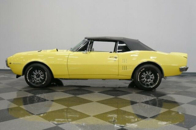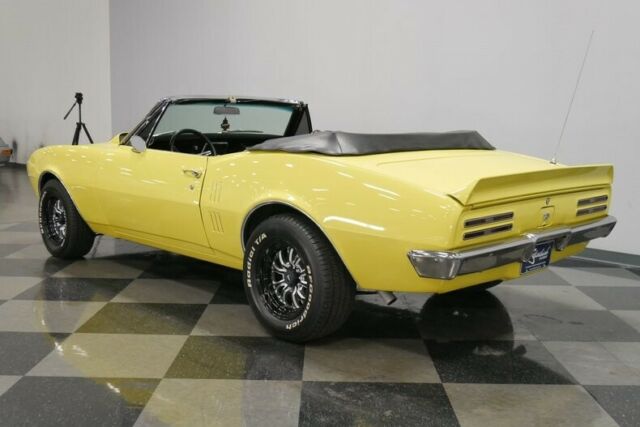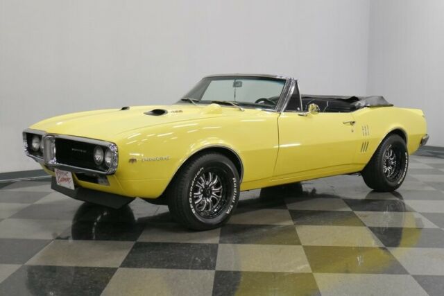 This clean 1967 Pontiac Firebird convertible looks subtle but packs a 350 cubic inch punch under its pointed hood. Even better, there's a lot of recent work, turning this lovely convertible into a great cruiser that has a real muscle car look. Add in a handsome interior and a top that goes down, and you have a great choice for warm weather fun. That's pretty close to factory code Y Mayfair Maize on the body, surely the... same stuff they were putting on Corvettes and calling Sunfire Yellow, and it looks just as good here. It isn't this car's original color, but it obviously looks right. The paint was done not too long ago to a very good standard, giving the car a clean, crisp look that definitely has an appeal. Straight bodywork underneath surely helps, and the crease that runs from nose to tail is crisply defined and the gills in the quarter panels are a cool contrast that helps break up the otherwise smooth body. Gaps are good, which can be a challenge on a ragtop, and it's thankfully devoid of stripes or add-ons that would spoil the effect. Instead, this car isn't trying too hard and simply lets the hardware to the talking. There's nice chrome, too, including the pointed front bumper/grille assembly and the Firebird emblems are crisply rendered. Sure, there's plenty of F-body DNA there, but the Firebird has a very distinct flavor that's different from the Camaro. The black bucket seat interior is also nicely restored with reproduction seat covers front and rear, newer black carpets, and a no-nonsense look. The steering wheel is a little thicker and a little smaller in diameter than the original and it's parked on top of a tilt column that actually makes a big difference in comfort. Factory gauges are in good condition with a 120 MPH speedometer as standard equipment, and that hood-mounted tach is about the coolest factory gauge ever. A factory AM radio is still in the center of the stack, but it's disconnected in favor of a modern AM/FM/CD stereo head unit that's stashed out of sight, a nice decision that preserves the original look. The black convertible top is power actuated and the trunk is finished with a reproduction mat that fits well. A 350 cubic inch V8 makes this lightweight F-body feel insanely fast on the street. Even though it's the same size as a Chevy small block, it's unique and has its own personality. Dressed with Edelbrock chrome dress-up and a 4-barrel carburetor, it's got instantaneous throttle response and a later HEI distributor lights it up with ease. It's beautifully detailed with Pontiac Turquoise paint on the block and the satin black engine bay makes a perfect backdrop. A big radiator doesn't seem to mind the engine's heat and it's got power front discs with a new master cylinder and distribution block, and power steering makes it easy to drive. A TH350 3-speed automatic makes for an easygoing personality in this convertible and it spins a 10-bolt rear end with reasonable gears that definitely help. Custom black powdercoated wheels look awesome against the black paint and carry 215/65/15 front and 245/60/15 rear performance radials. Lots of fun to drive with a look that speaks softly yet carries a big stick, this Firebird more than delivers on the promises made by its look. Call today!