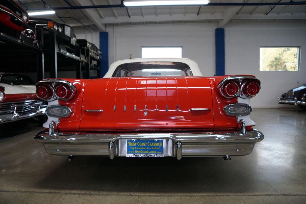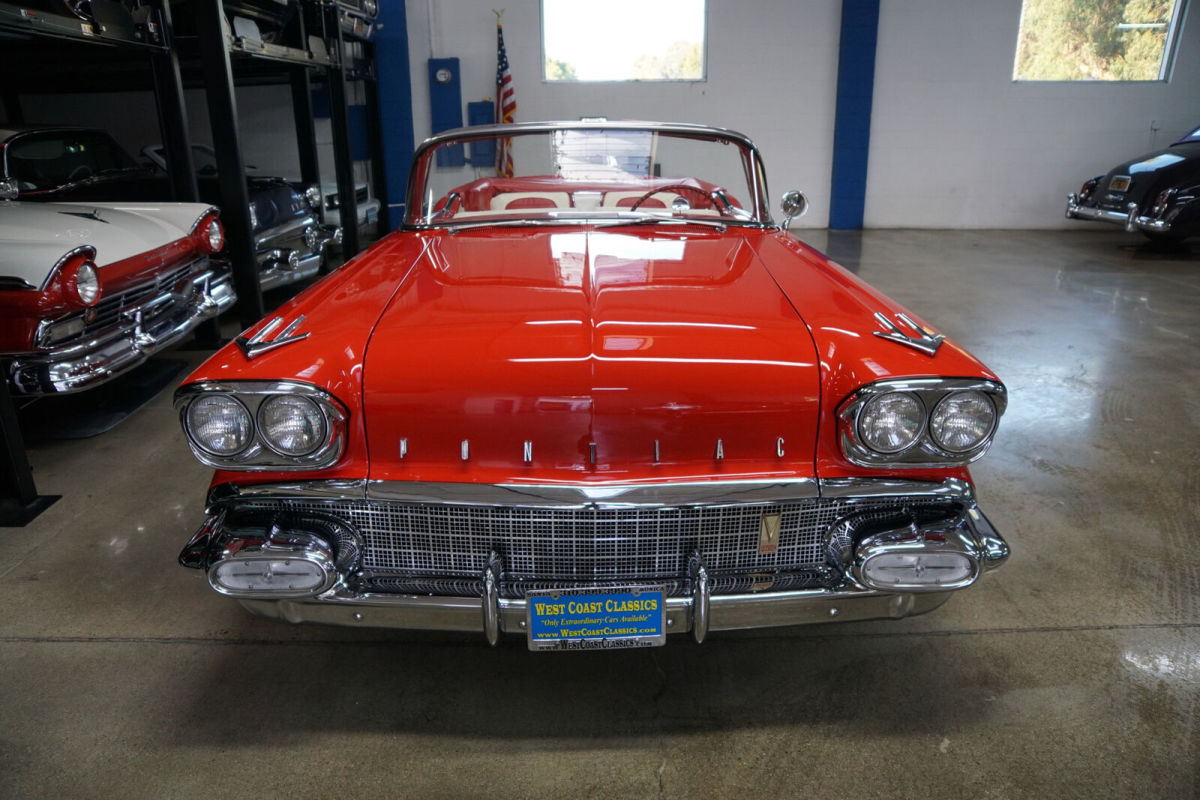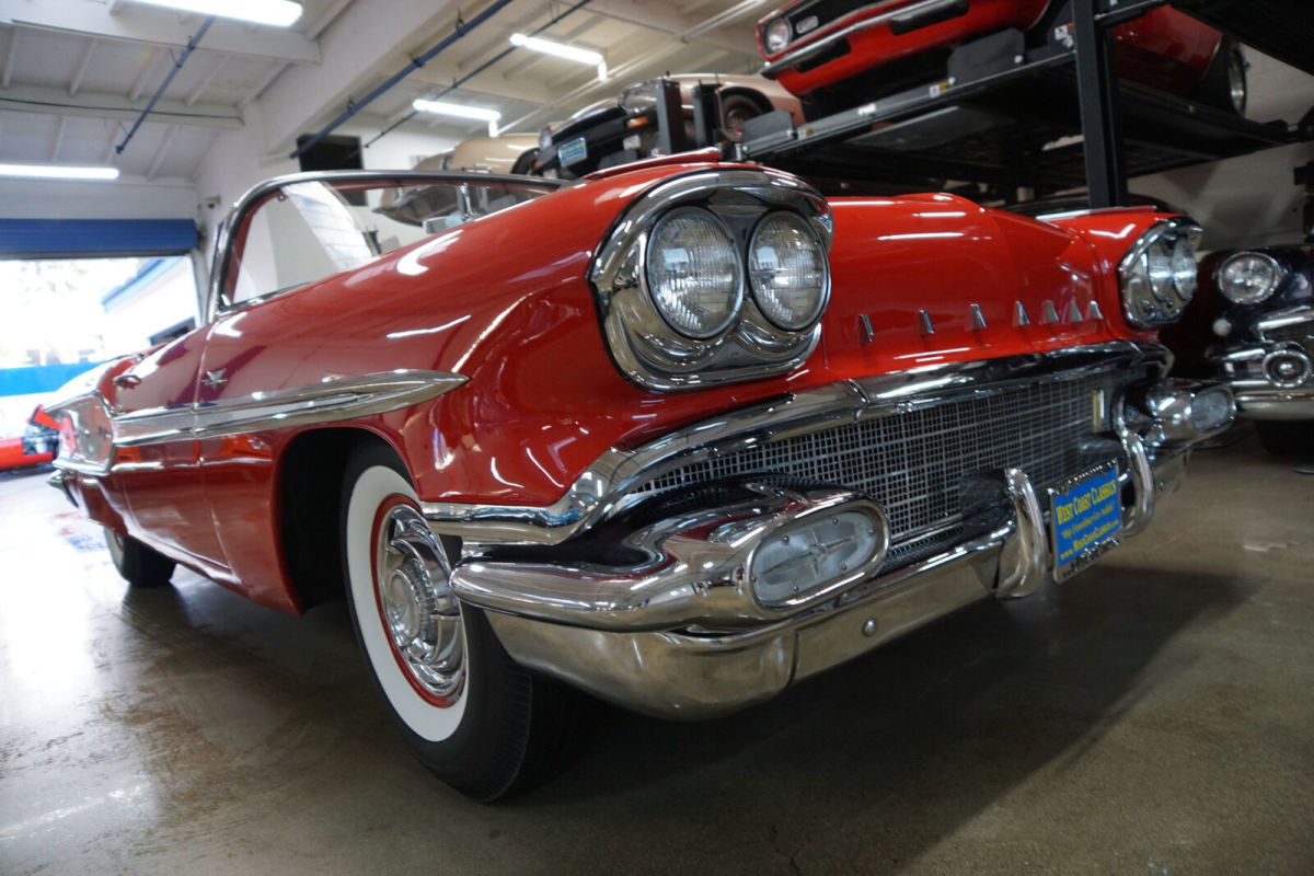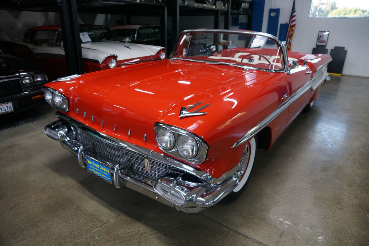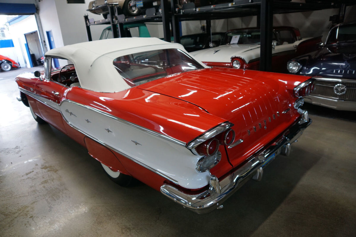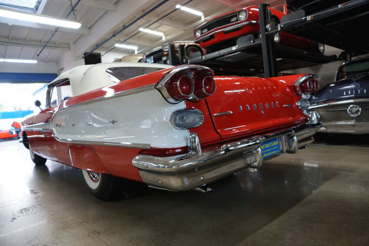 West Coast Classics are proud to present an absolutely exceptional and completely rust free example of this recently both mechanically and cosmetically restored, and with only very few miles since being restored, of a mostly all original 1958 Pontiac Chieftan 370/300HP V8 3x2 BBL Tri-Power V8 6 passenger Convertible in a beautiful and extraordinarily striking two-tone 'Rangoon Red & Patina Ivory' color and with an absolutely beautiful all new 'Red & White' interior and with a new White power soft top! One of only 7,359 built in the very last year of production. The car is loaded with factory options including; Power Steering ($108) Power Brakes ($38) Power Antenna, Full wheel covers with wide White sidewall tires, AM radio, Heater & Defroster ($91), Power Convertible Top, Full length bodyside stainless trim, and with this ragtop dressed to kill with factory fender skirts and dual exhausts! Purchased from its most recent southern California owner and obviously always garaged and rust free with beautiful bare metal floorpans and frame up restored in 2019. The car has very good gaps and flush fitting doors, the hood and trunk and the floor boards, rockers and all the typical rust-prone areas are original, solid and rust-free - obviously an always cherished 'Garage Queen' since new. All the original chrome has been re-chromed and the car boasts its original spare wheel in the trunk. The 370/300HP Tri-Power V8 engine has been fully rebuilt as has the car's 4 gear 'Hydramatic' automatic transmission. Consequently the engine is extremely strong and powerful and sounds absolutely magnificent and this particular car drives absolutely magnificently - must be driven to be believed - does not miss a beat and purrs like a kitten - drives straight as an arrow with no strange road wobbles, shakes or rattles - a truly remarkable daily driver that will give any modern day car a run for it's money! The transmission shifts smoothly through the gears and the car is an absolute pleasure to drive This is an extraordinarily rare opportunity to own a great daily driving and certainly local car show ready example of a mostly completely original spec 1958 Pontiac Chieftan Tri-Power Convertible, a unique and very distinctive and iconic one year only design of these rare luxury convertibles built in 1958, in absolutely stunning driving and looking condition! |