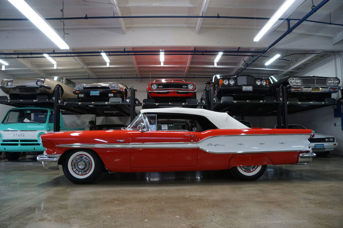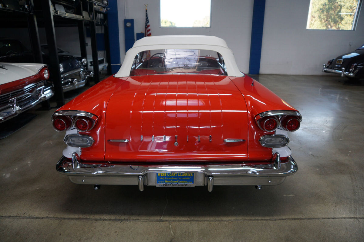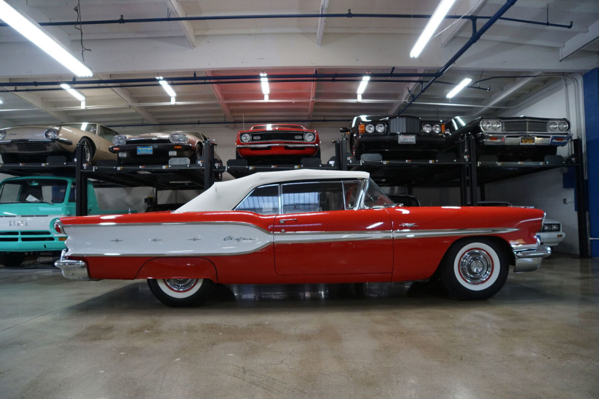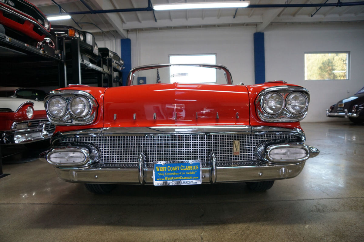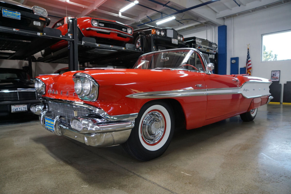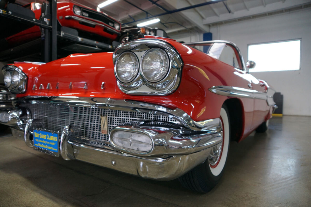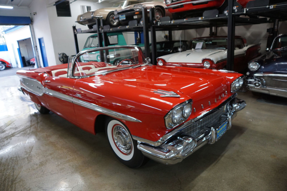 West Coast Classics are proud to present an absolutely exceptional and completely rust free example of this recently both mechanically and cosmetically restored, and with only very few miles since being restored, of a mostly all original 1958 Pontiac Chieftan 370/300HP V8 3x2 BBL Tri-Power V8 6 passenger Convertible in a beautiful and extraordinarily striking two-tone 'Rangoon Red & Patina Ivory' color and with an absolutely beautiful all new 'Red & White' interior and with a new White power soft top! One of only 7,359 built in the very last year of production. The car is loaded with factory options including; Power Steering ($108) Power Brakes ($38) Power Antenna, Full wheel covers with wide White sidewall tires, AM radio, Heater & Defroster ($91), Power Convertible Top, Full length bodyside stainless trim, and with this ragtop dressed to kill with factory fender skirts and dual exhausts! Purchased from its most recent southern California owner and obviously always garaged and rust free with beautiful bare metal floorpans and frame up restored in 2019. The car has very good gaps and flush fitting doors, the hood and trunk and the floor boards, rockers and all the typical rust-prone areas are original, solid and rust-free - obviously an always cherished 'Garage Queen' since new. All the original chrome has been re-chromed and the car boasts its original spare wheel in the trunk. The 370/300HP Tri-Power V8 engine has been fully rebuilt as has the car's 4 gear 'Hydramatic' automatic transmission. Consequently the engine is extremely strong and powerful and sounds absolutely magnificent and this particular car drives absolutely magnificently - must be driven to be believed - does not miss a beat and purrs like a kitten - drives straight as an arrow with no strange road wobbles, shakes or rattles - a truly remarkable daily driver that will give any modern day car a run for it's money! The transmission shifts smoothly through the gears and the car is an absolute pleasure to drive This is an extraordinarily rare opportunity to own a great daily driving and certainly local car show ready example of a mostly completely original spec 1958 Pontiac Chieftan Tri-Power Convertible, a unique and very distinctive and iconic one year only design of these rare luxury convertibles built in 1958, in absolutely stunning driving and looking condition! |