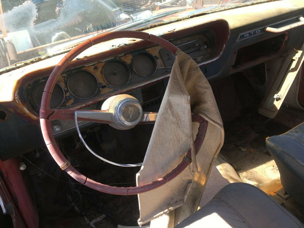 1965 Pontiac GTO hardtop. Car is very rust free except it needs a new trunk and has surface rust, no holes. Vehicle was originally a 389 4 bl, 4 speed. Interior was originally blue and front and rear seats are included. Car is for sale locally and sale will be closed if sold. Vehicle will be made mobile for transport with tires. If 3rd party is used for transport please be sure they are able to transport vehicles that are non-running. If 3rd party transport is used I will assist with getting the transport completed. As the pics show i