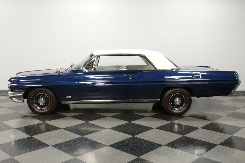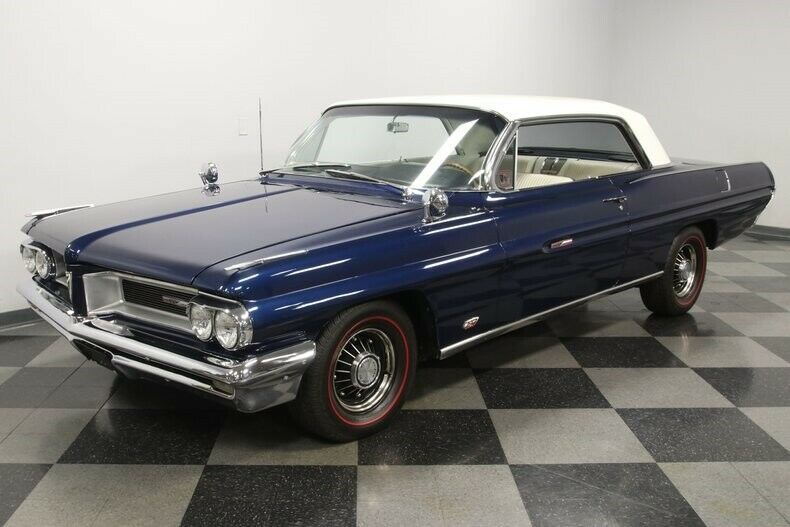 A true premium range-topping full-sized coupe, this 1962 Pontiac Grand Prix is the car that launched the legend. So when you can get a hardtop in a terrific color combo, great classic features and big upgrade to a tri-power V8, then you know this is one special classic. Pontiac really understood how to bring performance and luxury in equal measures. They decided to really showcase this in '62 with the introduction of the Grand Prix. The Wide Track look was really taking effect with the quad headlights, broad split grille, and taillights that were pushed all the way to the corners. And with all this sheetmetal, we love the upgrade to a professional application of a sophisticated deep blue that also has a nice metallic radiance. Not only does it look great on its own, but also it provides a cool contrast to bring even more attention to the white hardtop roofline. The details are premium, too, with well-integrated chrome bumpers, stylish badging, and Pontiac's distinct 8-lug wheels really help make this a true boulevard king. Inside is more of the merging of sporty and premium. You see this best on the seats. The bright white looks to be part of a fresher investment, and there's blue carpeting and a blue dash to really give you a similar color theme as the exterior. Not only do you get bucket seats up front, but the premium texture style was exclusive to the Grand Prix. And it's all done in a supple leather! There's plenty of room in the back to carry family and friends, and they even have a fold-down armrest when they want individual comfort. The curved windshield, ultra-wide dash, and stylish center console give this a feeling of expansive luxury. Plus, everything from the AM radio to the center-mounted tachometer are working in this well-maintained interior. There are even some terrific upgrades that have been well integrated. For example, this has a factory-style air conditioning setup that's running on modern R134a refrigerant (it will need servicing to function again.) There are AutoMeter Sport-Comp auxiliary gauges added to the dash to give you the full picture of what's going on under the hood. To live up to the Grand in the Grand Prix's name, Pontiac gave these their best V8s. The top-dog was the 421 cubic-inch unit. This one goes one step further than factory ever did in the inaugural year, and now it also has Pontiac's famous triple set of dual barrel carbs. And every Pontiac fan know the three little polished air grabbers on top of a big V8 mean Tri-Power. This engine bay has been treated with proper care, and so you have the right classic pieces, right down to the fender-mounted glass washer refill bottle. But upgrades like the Pontiac cast valve covers and the Griffin aluminum radiator also tell you the investment was about keeping this a great cruiser, too. Then you add in great features like the three-speed automatic transmission, power brakes, power steering, and a supple ride. It's this fast moving and luxury cruising attitude that makes the coupe so desirable. We have notes on this car that say this was given a complete frame-up restoration in 2010, and there's a terrific quality over every inch to back up this feeling of a solid investment. It all means this is your chance to get a prime example of the first-ever Grand Prix. Call now! |