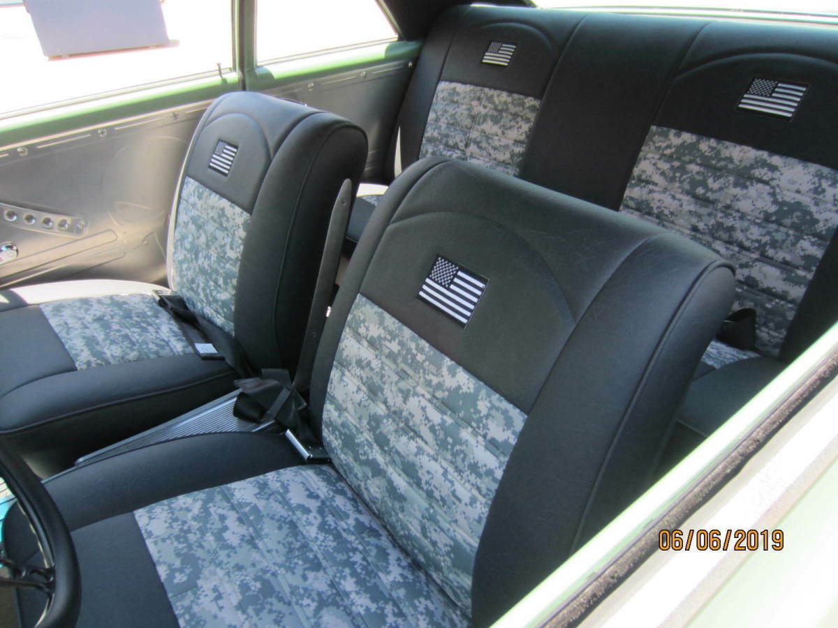 1965 PONTIAC GTO COUPE - CUSTOM COMMAND CAR FOR MILITARY MUSCLE WITH "THE PUNISHER" LOGO COMPLETE CUSTOM FRAME-OFF RESTORATION ---------------------------------------------------------------------------------------------------------------------- This vehicle is not the norm for our shop, but it has instilled in us the true desire to honor all the military and first responders that serve our country with their lives on a daily basis. These men and women serve us proudly without hesitation.They work every day to ensure our FREEDOM because freedom is not FREE! The stock full frame has been cleaned and painted with POR-15 resulting in a clean gloss finish. The rear end is a rebuilt 12 bolt Chevy unit with 3.73 gearing. The rear suspension consists of CPP (Classic Performance Parts) tubular 4-link control arms that locate the rear axle in the frame with black polyurethane bushings and new coil springs. The front suspension consists of CPP (Classic Performance Parts) tubular upper and lower control arms with a 2 dropped spring pocket and a 2 lower coil spring that connects to new spindles with a CPP (Classic Performance Parts) front sway bar. The complete steering system from the steering box to the tie rod ends is new. The brake system has been upgraded with chrome dual reservoir master cylinder and chrome vacuum booster. A fully adjustable proportion valve allows adjustment for the four wheel disc brakes. New steel brake lines and rubber brake hoses complete the upgraded system. ---------------------------------------------------------------------------------------------------------------------- The fuel system has been rebuilt and upgraded with the following items: -New fuel tank and fuel sending unit were installed. -New fuel lines were installed that would be compatible with the fuel injection. -External high pressure fuel injected fuel pump with pre and post fuel filters was installed. -The fuel injection system is a S.D.S by Chico Kodama at the Moon Eyes Company. -The 6 throttle bodies started out as a solid billet piece of aluminum and were milled to look like 97 Strombergs. Each one has two fuel injectors in them. The throttle bodies are mounted to a special SIX pack manifold. The fuel constant 45 PSI fuel pressure is controlled by a billet fuel regulator with a gauge. -The fuel injection main computer box is mounted in the passenger compartment along with the programmer control box. The control box is mounted center stage in the custom dash where it can provide constant engine information for "ON THE FLY" calibration adjustments to be made. -Fine adjustment mixture knob is also mounted in the dash in arm's reach of the driver. -Cold start idle control solenoid switch has also been added to the fuel injection system to aid in cold start-up idle. This switch is a real Aircraft locking two-stage switch. -Custom throttle linkage and transmission kick-down control systems were installed. -Be Cool aluminum radiator with twin electric fans keeps the engine cool. ---------------------------------------------------------------------------------------------------------------------- The engine is a GM Performance 350 crate engine with a moderate camshaft. The relocated engine mounting pads move the engine rearward for a better weight balance. The engine is mated to a TH350 automatic transmission with a 2500 stall converter. A freshly rebuilt drive shaft sends the power to the rear axle. The Lokar shifter has been modified to accept a modified authentic attack helicopter aircraft joy stick for the handle. The SILVER button shifts the transmission, and the RED button fires the horn! The tires are low profile Hankook with 225/45ZR17 on the front and 245/45ZR18 on the rear. The rims are Billet Specialties Five Spoke aluminum rims that have been custom painted with a two-tone design to match the body colors. The body has been completely rebuilt with new interior and exterior rear quarter panels, rocker panels and a complete new floor. All remaining panels were worked and epoxy primed before moving into the painting process. The completed underside of the body and inner front fenders were sprayed with undercoat. The interior floor is sprayed with Raptor bed liner for a rugged look that will clean up easily. A new black headliner and sail panels were installed. The door panels and rear seat interior panels are custom aluminum panels embossed with the skull logo of the American sniper "The Punisher" that were custom built for this project by Big Wig Race Cars. The dash has been updated with custom AutoMeter gauges. The dash and center console chrome trim has been painted in a hammer-tone of silver and black. The hammer-tone has been carried outside to the body panels and is applied to all trim parts, and it has also been used on the new front and rear bumpers. Front fenders GTO emblems have been customized with the hammer-tone silver, black and white scheme. The front and rear GTO emblems and Pontiac logo are painted in fluorescent white. The original front bucket seat frames were stripped and rebuilt. The foam was custom contoured and covered in a custom designed ultra leather consisting of an old school black and a digital green with silver camouflage center insert that carries to the back of the seats and to the rear bench style seat. To top it all off, all seats have "Special Operations" black and white American flag shoulder patches located in the shoulder blade area. Driver and passenger side visors have been custom made to locate the target in front of you. Dark colored Lexan is cut in the shape of a Fighter Pilot sun visor. In the center of each visor is an aluminum ringed cross-hair targeting system. The original steering column has been rebuilt and painted the body color. A pro touring design steering wheel tops the column. The vehicle was rewired with an American Auto wire system and is ready for any upgrade such as A/C or power windows. All the glass is new including the window felts, rubbe