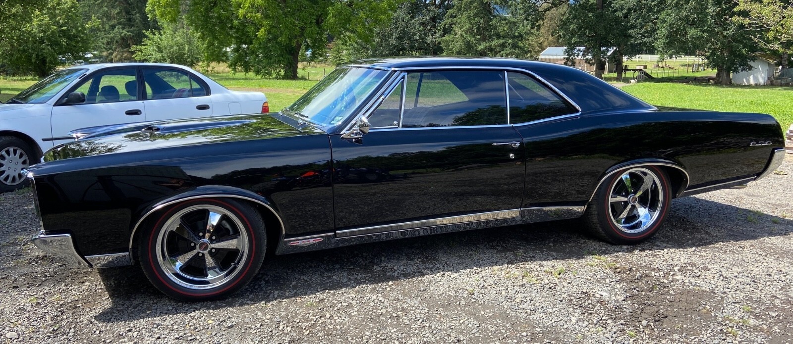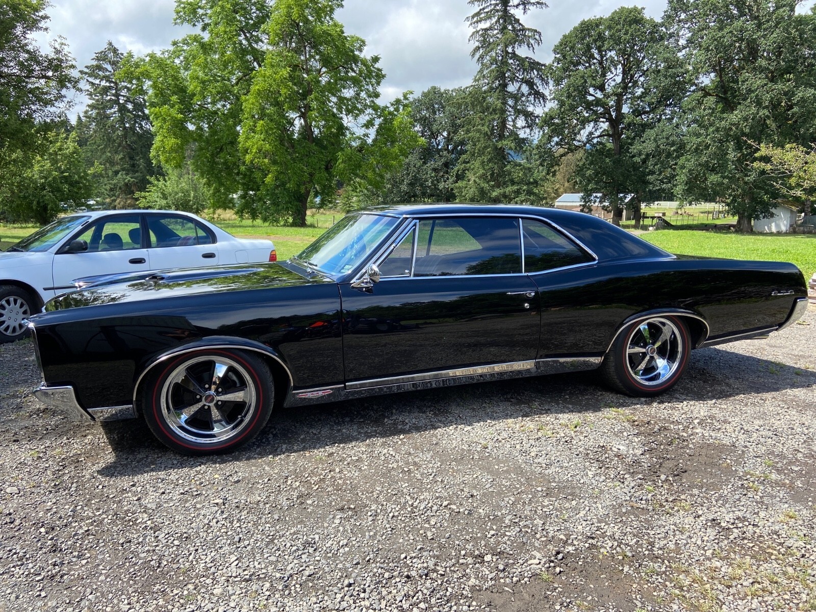 Chassis & Suspension:Exterior & Paint: Finished in Glasurit paint, known for its deep gloss and durability Classic GTO lines restored to perfection The Pontiac division got it all right this year. Stacked dual headlights framed with pristine mirror-like bezels flank the iconic split grille with signal lights and GTO badging, and a lower bumper with nary a mark or dimple on it. Looking down the line towards the rear we can see only straight steel, well minded gaps, and miles of shiny black paint covering broken up by a lower stainless rocker cover. Custom pinstripes help the paint stand out. A long straight scooped hood backs up to clean glass all around all framed by shiny polished trim. Moving to the back a long laser straight trunk lid curves downward to the foursome of horizontal thin rear taillight clusters, and more gorgeous framing of chromed trim and a snappy rear bumper. Lest we forget all the crystal-clear glass.All the chrome is like factory original or rechromed and the stainless trimmings are restored original parts. Throw in some 5 spokes custom styled PMD wheels and wrap them Redline rubber tires are ready to live it up in 1967 style.