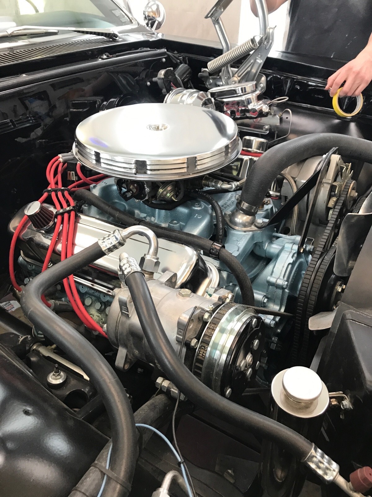 Interior & Comfort: Legendary Interiors upholstery – A beautiful blend of original style and modern quality Vintage Air Conditioning – Modern comfort in a vintage package You can take this interior to the bank in black...the vinyl is just beautifully redone, well preserved, and pristine. The door panels, front low back tuck and roll vinyl buckets and the rear bench are like new. A wood appliqué topper covers the center console which races through the front buckets making room for a floor shifter and goes forward to hide under the original dash.The dash itself has a wood appliqué front with sweet inset sweep circular gauges, some knobs and pulls in chrome and a retro modern AM/FM stereo radio. The top of the dash is padded black vinyl and is nearly perfect. A factory 3 spoke wheel with tilt steering wheel fronts the appliqué. Black carpet floods the floors along with mats.The headliner is perfect, and it has a working interior light in the center. Life just does not get any better with this snappy restored and rebuilt interior!