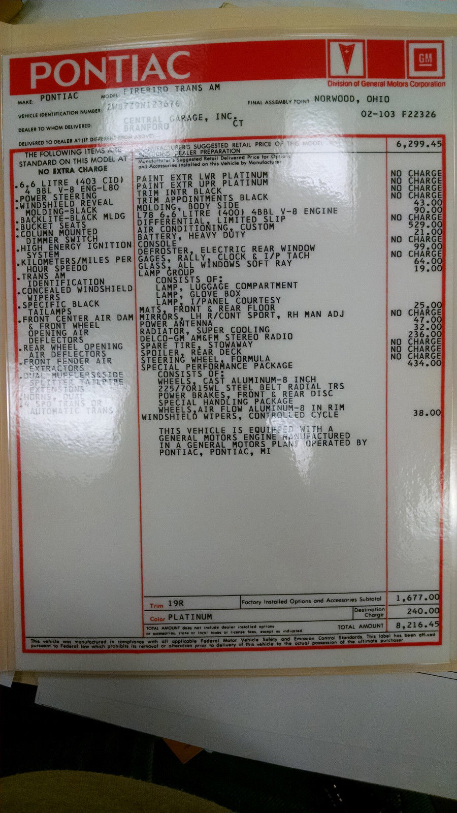 | 1979 Pontiac Trans Am 6. 6L 4-SpeedMiles - 57. 97Vin # - 2W87Z9N123676- Near completed project- Runs and drives very strong. engine recently rebuilt- Repainted 2 years ago- Paint job is good but not perfect. there are some small blemishes. - Behind one rear tire. there is some very small rust starting to come through as seen in one of the pictures. - Overall the exterior looks very good. - Interior I was redoing when I stopped on this. - I have installed new weather striping and window felts on one side and have not got to the other side yet. Parts are included for that and rear deck and headliner. - Old headliner has been removed. new one not installed yet. - Cad converters were previously taken of when new exhaust piping was added. I will include them with the spare parts. Currently very loud!- Very good solid driver. great looking car. - I am also including PHS documentation. - I am selling most of my collection. just sold my 1980 pace car yesterday on Ebay. I will price this car to sell. Car is in Milford. CT. If you would like to come take a look for yourself or call for more information (203) 676-7675. Car is sold as is. where is. Happy to work with your shipper. Please come and see for yourself. Car is registered in CT and sold with bill of sale. CT does not require titles on vehicles of this age. |