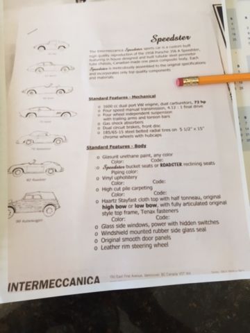 I purchased this Intermeccanica 1958 356 Speedster replica in 2009. It was built in 2007. I was searching for about 3 years for the right speedster and I found this one on Craigslist around 1:30 in the morning. Couldn't get one minute of sleep until I called Henry from Intermeccanica and he confirmed that this was one of the cars he put together. I purchased it sight unseen and am very happy with the result. I found out from Henry Reisner that this car was ordered loaded from its previous owner, hich includes 170 H.P. Handles like a dream after the mechanic I brought it to told me to drive it hard to clean out carburetors. I sent it back to Henry to install a new sound system and some other minor changes. Very well constructed.