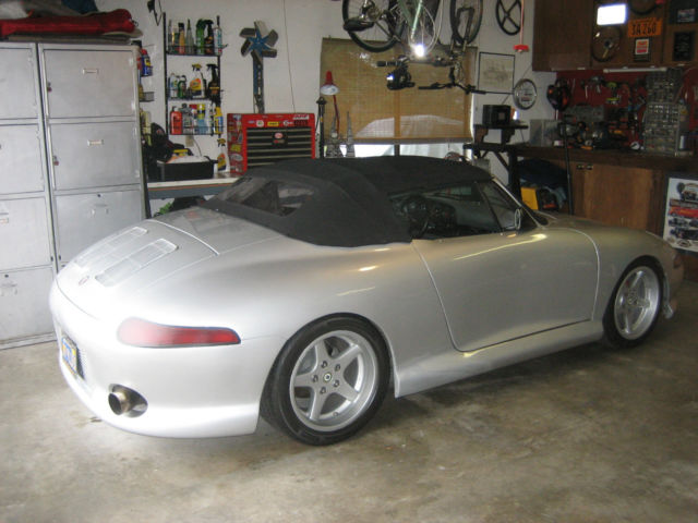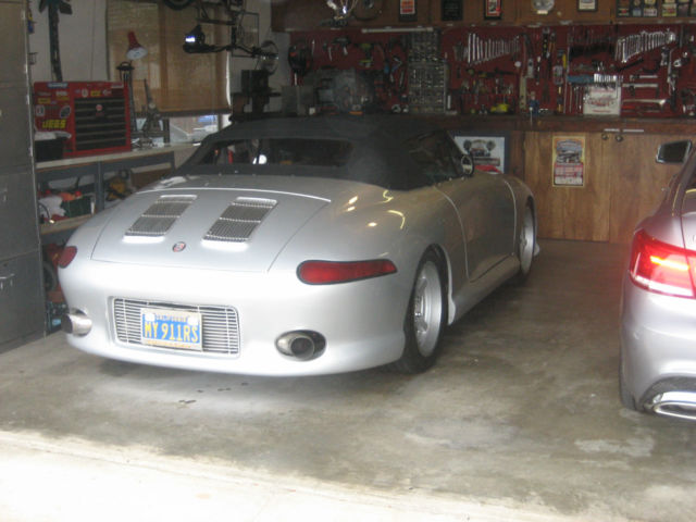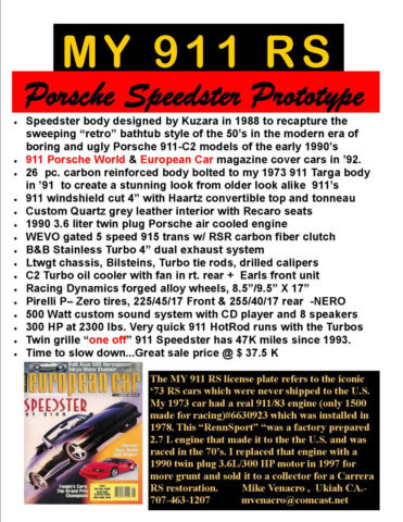 A "one of kind" Porsche 911 custom speedster built by Dion Sportscars,Long Beach,CA in the 90's as a prototype for magazine shoots.This REBODIED 911 was built around my pristine 1973 Targa to evoke the styling of the 50's bathtub 356s',one of which I sold in 1988 (pictured).Kevlar/FG panels bolted to original fender holes leaving the hood,doors and chassis intact to restyle a traditional 911 into a modern day Speedster.Targa handle removed.windshield chopped 4",folding convertible top fabricated to mate to side windows/Targa header/latches used,Recaro seats,leather interior, 7"forged alloy wheels with Pirelli P-Zeros,Custom SS 4" exhaust,Turbo oil cooler in rt. rear fender,8 speaker tunes,the biggest air cooled 911 engine available...and what do you get ? DREAM SPEEDSTER. This very quick 2200lb/300HP was built to smoke the Turbos of the day and does hold its own.All work was done by race/restoration shops in the SF bay area with no expense spared.I have owned this car since 1989 when I sold my '55 Speedster. Lights,heater,gauges,wipers,clock are all in good working order.Needs nothing.Drive anywhere. Total mileage on engine less than 70K. Total on car 49K since '92. CALIFORNIA blue plate is registered through August 2016. Since retiring 8 yrs ago doesn't get much attention and its time to move on. Can be delivered to the port of Oakland,CA for overseas shipment. ]I have taken the reserve OFF to give it a new home On Aug-17-15 at 05:03:09 PDT, eller added the following information: Note to all Anal R's : The photo of Speedster from the front in the garage shows a white blotch on the passenger side parking lens...that is a bird bomb that was wiped clean for the headlight up position photo next to it. I sold my '32 Ford a couple of weeks ago and have been driving the Porsche for coffee every morning only to reinforce what a great car can do for our spirit. |