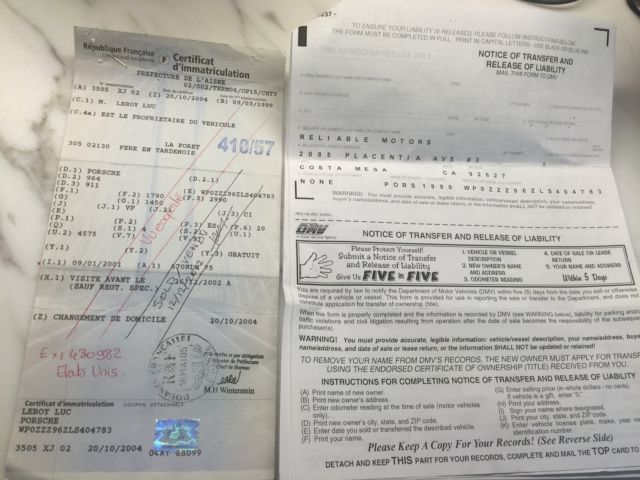 NO RESERVE. I bought this race chassis, years ago, ith the plan to get it titled, as it had a french title, ut no import docs anymore), hrough a lien sale (done), ut whenI presented the chassis to the DMV, hey refused to title it until the car was complete and running. They recommended taking it outof state to get it titled as is.The VIN number isWP0ZZZ96ZLS404783, ut as a european import, t did not get accepted above.My plan had been to make an outlaw 911 as the 964 chassis is perfect for that. I also had bought old RSR rear panels,and had plans to make it into a 73 RSR clone.Now with the uncertainty of getting it registered in California, nd not wanting to sink $100K in the build up on the hopethat it could be titled and registered here, prefer instead to pass this project onto someone else, deally out of state.I have had the car sand blasted, nd I have primered the bits which could corrode again. There is some corrosion in the roof,but otherwise it is pretty rust free. It has a full cage, ome weld repairs at the right rear, nd carbon fiber strengthening at critical points.Either build it up as a race car, r go the outlaw route I had planned.Vehicle sold as is, ith no warranty, mplied or otherwise.