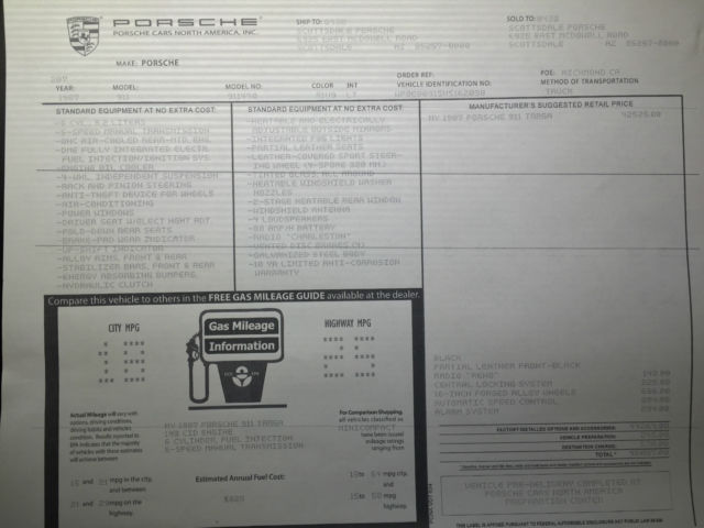 | This 1987 3.2 Carrera Targa is a completely stock, low mileage example of the late of the 911 “G-series” body. This is a three-owner car owned by variouscollectors. The car has remained in the NY/CT region for it’s entire life and alwaysgaraged and pampered. It reads only 7,268original miles on the odometer. Equipped with a 217hp 3.2 liter flat six and the very desirable 5 speed “G50”, transmission, this is a very crisp and easy to drive air-cooled Porsche. The car was ordered with factory options such as black Fuchs alloys with painted Porsche center caps, black paint and black leather sports seats. The paint is near perfect with very minimal imperfections and the interior is in mint condition. There has been an Alpine radio installed in the car, however the vehicle is also sold with its original Blaupunkt stereo. The Targa top – including the glass, removable hardtop, seals, and brackets – are all in good shape, showing no signs of major leaking when the car is detailed. The car is sold with service documentation and Porsche authenticity certification. |