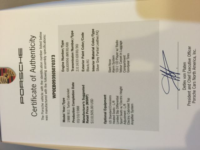 This is my 1988 Porsche 911 Turbo (930) with the factory slant nose. I'm told it was one of perhaps less than 300 outfitted from the factory as this one is or the US, convertible, turbo and slant nose. I've owned the car for approximately 4 years and have only put about 4,500 miles on it. It's the 4th vintage/aircalled Porsche that I've owned and it is my favorite of the bunch so far. Ihave most of the repair records and those that I do not have are kept at my mechanic's office. I also have theCertificate of Authenticity as well as a duplicate of the original window sticker, both of which show the slant nose option, which was a ~$30,000 option at the time. This one has the Speed Line wheels, which was also a Porsche upgrade. This car has not been modified; it's all original with the exception of the upgraded exhaust; sound really good. The Air Conditioning on this 930 blows a little above average for these cars based on my past experience. It has the original tool set as well as the Air Compressor, equipped with a tether to keep the battery charged while it sits and also comes with a car cover. It's a pretty rare car, an attention getter and one that you'll thoroughly enjoy. Thank you for looking. |