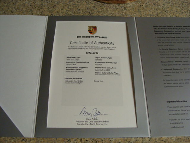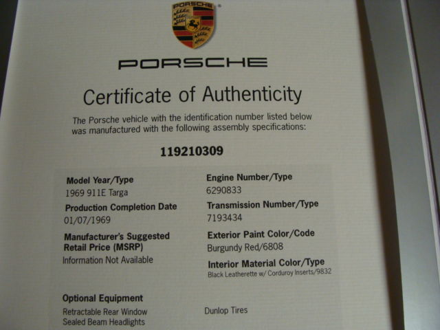 1969 Porsche 911E Original rear Soft Window with COA VIN 119210309-engine 6290833-installed 6290838-transmission 7193434 This car is a very rare car, the records say that there wer, maximum 12 911E soft windows made for the year.Everything is matching, but the engine, however there are only 4 engines in between the original one and this one, in other words, totally correct engine for the car,since there were 69 911's with serial numbers starting from 9-1-1 and those came with the 2.2 engine, which would be 69 engines but not correct for this car.This car being so rare, it should not matter a whole lot when you have only 12manufactured, but not known how many survived.The car was completelydisassembled and restored in and out with innumerable new and rebuilt parts, all the chromed parts were sent to the chrome shop and they came back looking like new, the engine was rebuilt with higher compression pistons and cylinder to 9.5 to 1, buyer must follow Porscherecommendations for brake-in procedures.Finally we got the COA from Porsche, the rear soft window they call "retractable rear window" it is supposed to have Corduroy inserts for the front seats but I have not been able to locate the correct Corduroy material to do it.The car is originally Burgundy color, it has been painted golden Lime Green.This car is a very good investment, it can only go up, with so few for the year.The car is running on rebuilt Webers, the title is clean and in hand. The COA will be delivered with the car. Buyer must deposit $2000 by PayPal immediately upon sale agreement, rest by bank transfer, we will assist to expedite transportation. happy biding!