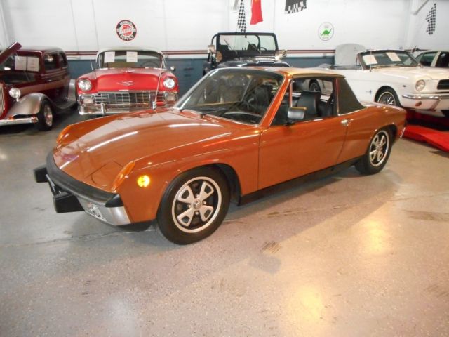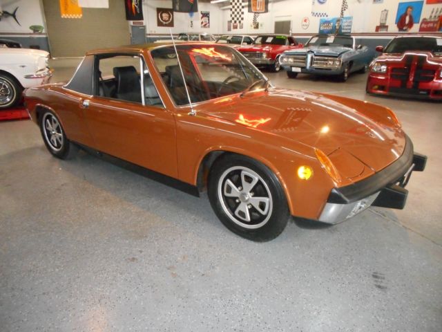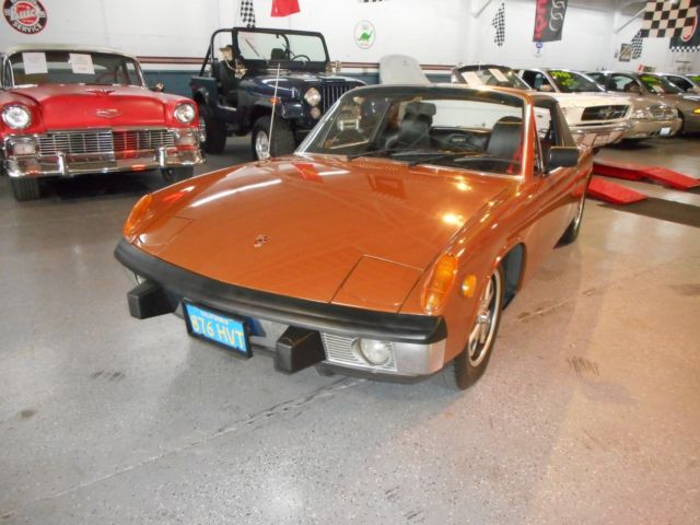 Garage find a 1973 Porsche 914 2.0 only ONE OWNER and only 132,200 original miles. All new car docs.( original delivery in San Carlos, California), including original contract, window sticker, owners manual, all original keys, custom car cover, maintenance record with all receipts since new and even a service repair handbook. This car has had only one re paint to original color Sepia Brown (paint to sample), with Black interior. There is NO rust and NO rust repair, all original sheet metal and original alloy wheels, rebuilt motor and transmission about 40,000 miles ago with custom exhaust. The only thing changed was the radio. It has a 5 speed manual transmission for better MPG and all the gauges and head lights work as they should. This little German sports car runs and drives great, shifts easy, good MPG, seldom seem and a very sound investment. Now on display at the home of “over the top cars”CHECKERED FLAG CLASSICS 7743 MONTEREY ST GILROY, 408-847-8788 or 888-625-2774, sold as-is, California buyers are responsible for sales tax and license fees. Bid with confidence I am a licensed bonded California dealer. The dash has a crack a dash cap would be perfect and cheep