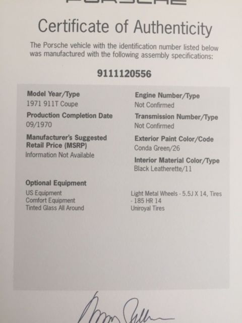 1970 porsche 911T .need restauration very good body miner rust see photos engine turn by hand engine believe to by a 1973 . original color conda green Factory option US equipment comfort equipmen, tinted glass all around Can help for export sold as is.if you have any question email or call404 291 0497 Car is title as 1970On Mar-28-18 at 13:21:27 PDT, seller added the following information: