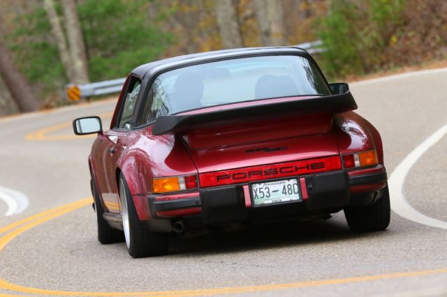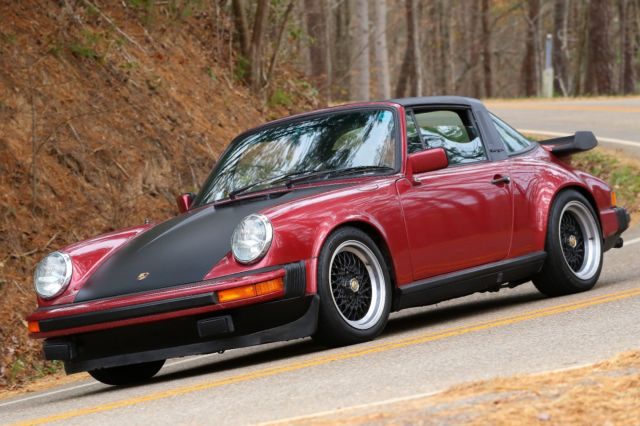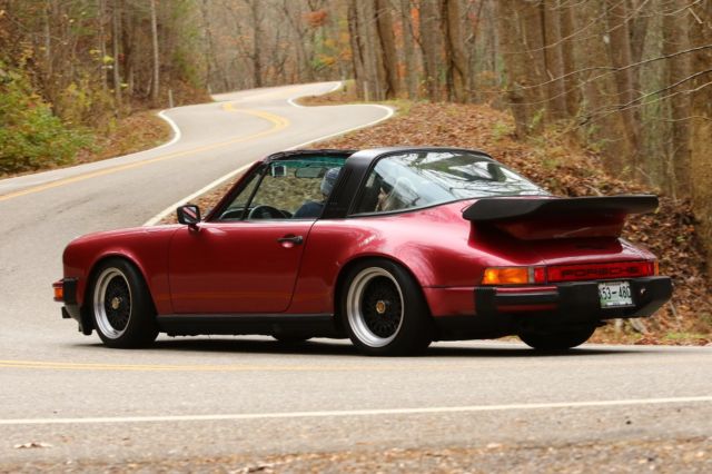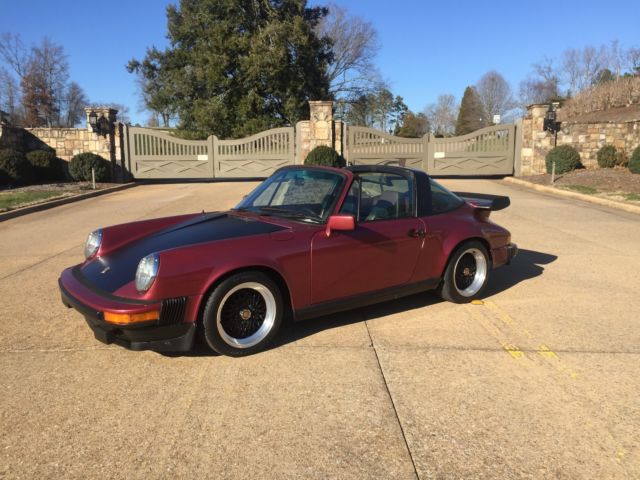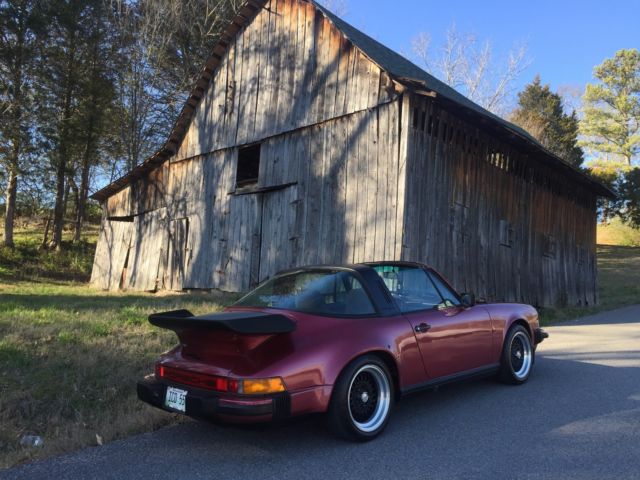Rare Opportunity - Real Head Turner - Very Good to Great Condition; Always garaged and covered. Never driven in the rain or on wet roads. Period BBS Wheels with original Fuchs (refinished). Continental Extreme Contact tires - like new. Rare Original Wine Color. Sport Interior - Brown; Targa top in very good condition, a bit tatty (metal braces need refinishing) on the inside (nothing broken or ripped). Back seat always folded down - needs minor attention (snap straps broken). Three owners since new - 2nd owner is elderly neighbor who owned the car since 1983/4 - 2015. Second owner dry stored the car from 2005-2015. No mechanical issues - engine rebuild by Porsche Dealer at 79K miles. Has AC but is not used - AC needs servicing. New Headlight washers not connected. Mostly Porsche Dealer Service Records since 1983. PCA Member. Located in Knoxville, TN Pictures are on the Dragon, US 129. Featured in PCA online magazine in 2016. New front spoiler (old is shown in pictures), new momo steering wheel (have original), new strut bar, new air intake @ left bumper blinker. Engine picture is when it first came out of storage. New Wine colored cover (plus original cover - tan) Last picture is the modern inspiration for the paint combination. While in storage two places on the front hood had paint peel. (about 3" by 1"), not due to rust or anything - see picture. Rather than try and match the paint, I copied the modern look and it turned out fantastic. Easy to take back to all original if that is your thing. I start and drive a few miles once or twice a month. Needs to be driven and enjoyed more. I would love to keep it but it is just taking up space. engine video: https://youtu.be/08_4dEmkBd8