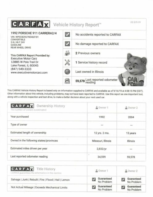 1992 PORSCHE 911 CARRERA 2! GRAND PRIX WHITE/MARINE BLUE! 2-OWNER! CLEAN HISTORY! 5-SPEED MANUAL! POWERED CONVERTIBLE! SPORTS SEATS! LIMITED SLIP! PLEASE NOTE THATMOSTOF OUR CARS SELL BEFORE THE EBAY AUCTION ENDS. IF YOU HAVE DONE ALL YOUR RESEARCH AND ARE LOOKING FOR A NICE CAR, YOU WILL KNOW THAT THE “BUY IT NOW”PRICE OFFERED BY EXECUTIVE MOTOR CARZ IS A GREAT DEAL. **BUY FROM AN EXPERIENCED EBAYER!!!!! **OVER7 YEARS ON EBAY!!! **VEHICLE HISTORY REPORTS RAN ON ALL CARS!! **WE SHIP ALL OVER THE WORLD!! **ALL CARS ARE HAND PICKED BY THE OWNERS, NOT 3RD PARTY PURCHASED!!! *CANADIAN BUYERS WELCOME, OVER 6 YEARS EXPERIENCE IN SHIPPING TO CANADA. (WWW.AA-AUTO.COM/CANADA.HTML) We try to advertise all our vehicles as accurately as possible, but please consider that they are all pre-owned. We do our best to make sure the vehicles look great, but please realize that they may have minor flaws in the paint or interior. Using our experience and knowledge, if we feel that the car needs any special attention and it won’t jeopardize the look or value of the vehicle, we will have it professional addressed. Not all vehicles have a full set of keys, books, floor mats and other loose items. Additional miles on the vehicle may be due to local test drives. |