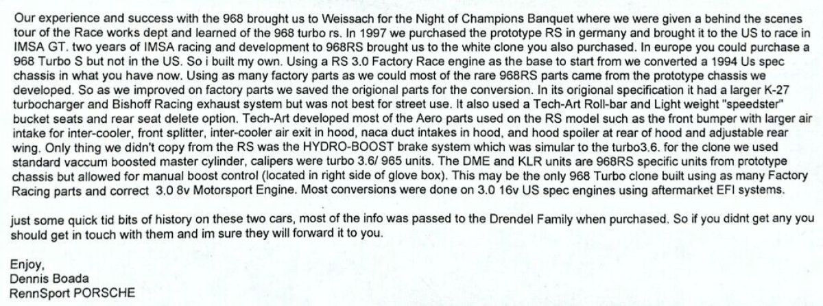 This is a 1994 Porsche Turbo S Clone with 13681 miles. Lloyd Hawkins, a well known driver and Porsche enthusiast was responsible for the build, with was executed by RennSport Porsche in Louisiana. While not a factory build car, this Turbo S Clone was constructed to an exactingstandards and is the only car fitted with a RS 3.0 factory race engine. -A Well-Executed Turbo S Conversion -Full Turbo S interior -Desirable Performance and appeal -Finished in its original white paint, this car has been meticulously prepared utilizing correct factory parts. Lloyd Hawkins, a well-known driver and Porsche enthusiast, was responsible for the build, which was executed by Rennsport Porsche in Louisiana. At present, the car displays 13562 miles, figure that is believed to be original. -An ideal candidate to track events -Car last serviced work completed January 2020 VIN:WP0AA2961RS820772 Ownership history Lloyd Hawkins Mathew Drendel Please only bid if you are absolutely serious about buying this beautiful 968Turbo S, all bids are final. If you have any questions relating to the condition please contact us before the end of the auction at Grand Prix Cafe / 631 353 3553.For more detailed pictures please go to www.grandprixcafe.com. All due diligence must be undertaken before you commit to purchase this car. Check pictures for some notes from Dennis Boada from RennSport Porsche: For any questions please callGrand Prix Cafeat 631 353 3553566 County Road 39Southampton, NY 11968Map and directionssales@grandprixcafe.comservice@grandprixcafe.com(631) 353-3555Prices subject to change without notice and do not include Title, License, Registration Fees, State or Local Taxes or Processing Fees, if any. Please contact seller first for vehicle availability. Although every effort is made to present accurate and reliable information, use of this information is voluntary, and should only be deemed reliable after an independent review of its accuracy, completeness, and timeliness. It is the sole responsibility of the customer to verify the existence of options, accessories and the vehicle condition before time of sale. Any and all differences must be addressed prior to time of sale. No expressed or implied warranties, including the availability or condition of the equipment listed is made. EPA mileage estimates for comparison purposes only. Actual mileage may vary depending on driving conditions, driving habits, and vehicle maintenance. |