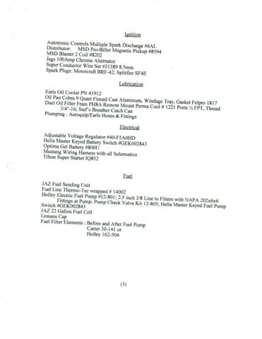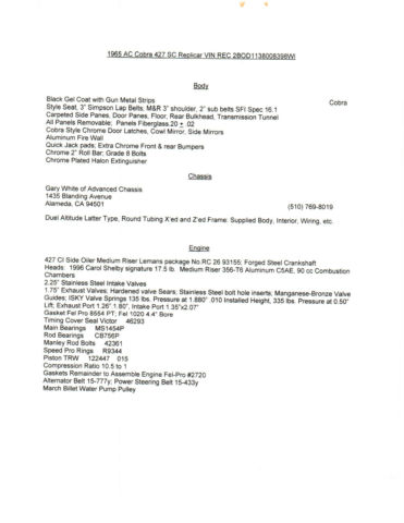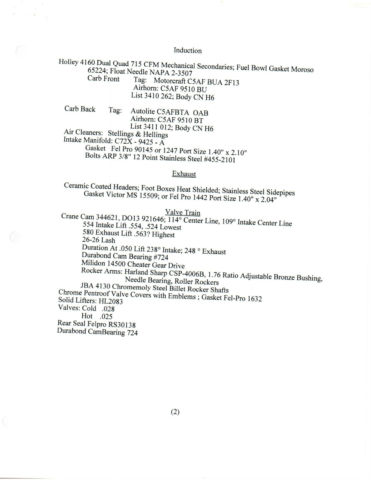 This is a 427 CI FE Side Oiler with Lemans Package. Carol Shelby aluminum heads, luminum dual quad 4160 Holley Induction. Gear driven Crane Cam with Harland Sharp needle bearing roller rockers. Ceramic coated headers, tainless steel side pipes. MSD #6AL with pro-billet distributor. 541 HP/531lb./ft - DynoSim in a 2300lb Car. JAZ 22 gallon fuel cell, lectric pump, op loader four speed, .50 Detroit Locker with Strange Engineering 31 Spline axles. Polished aluminum radiator, ove aluminum water pump, hree fans (Does Not Overheat) Dual Altitude X'ed and Z'ed round tube race frame with coil over shocks. 40 HP more than a 2005 Viper with 1000lbs. ALL WORK RECORDS INCLUDED for Body, hassis, ngine, nduction, xhaust, alve Train, gnition,Lubrication, lectrical, uel, ooling, auges, rive Train, uspension/Steering/Brakes/Wheels/Tires and all Suppliers. |