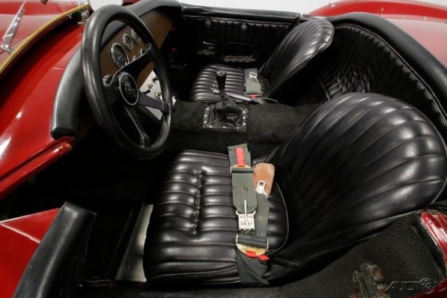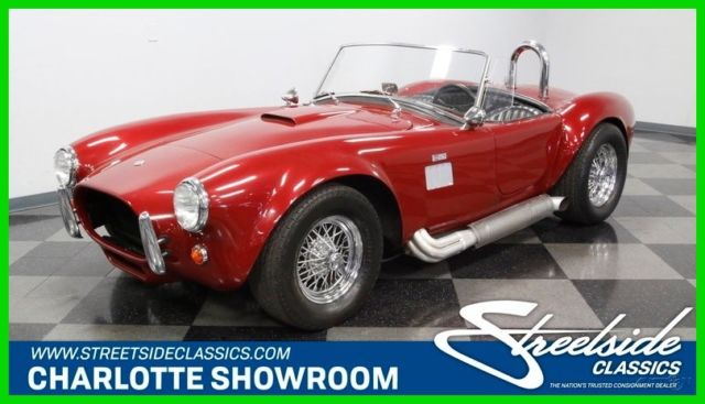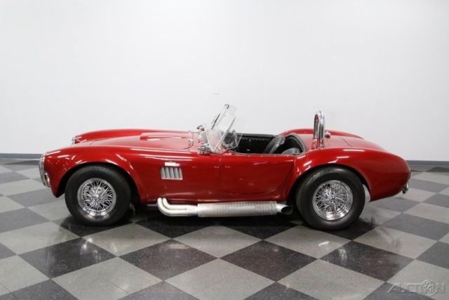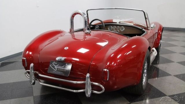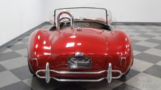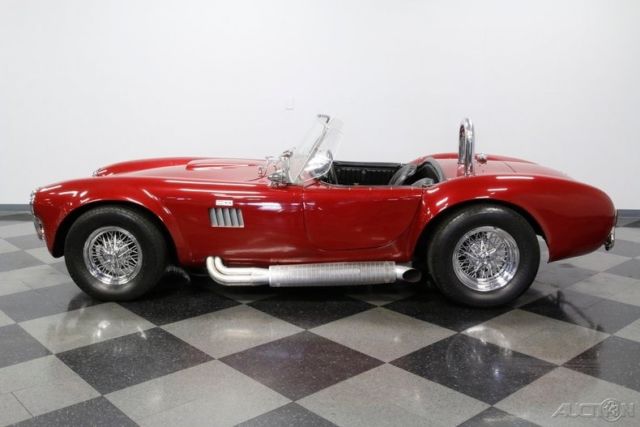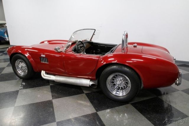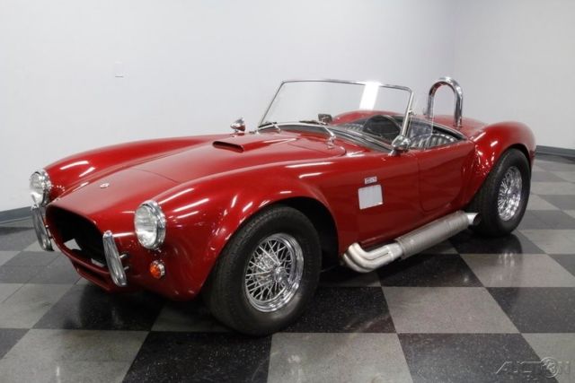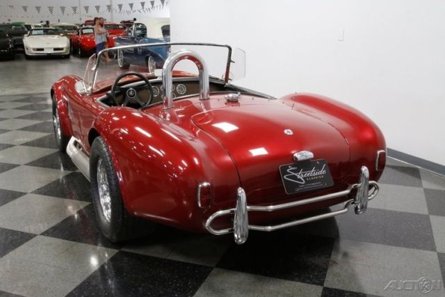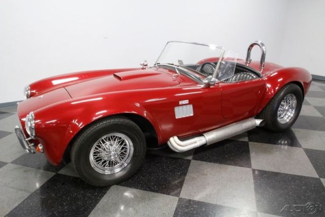 More than just a value price, this 1965 Shelby Cobra Replica is appealing, because they made it a much better driver's car. With a more comfortable interior, four-wheel disc brakes, a fully-independent suspension, and much more, you're looking at a great all-around deal. The look of a Cobra is iconic, so it only gets better finished in a deep and glossy maroon red that has plenty of metallic element to make those flared fender pop in the sunshine. Adding to this shine are great element like the racing-style bumpers, windshield frame, side air vents, and thick roll hoop. For even more distinction you have the real wire wheels. Not only do they offer that classic sports car appearance, but also, with the 14/15-inch front/rear stance, this one looks aggressive, too. Inside are all the completion-inspired elements you love about a Cobra. It has a full gauge package with a large speedo and tach; the steering wheel is nice and grippy; and the classic racing seatbelts provide plenty of function along with their vintage appearance. But what you won't find in many other Cobras is this level of comfort. The way the door panels are finished and the extra plushness of the seats really gives this an extra degree of usability. Plus, you get a full soft top and side curtain package for any time the weather turns wet. Under the hood is exactly what you want to see - plenty of Ford power. The 289 Cleveland V8 inhales deeply thanks to the large Holley 600 CFM four-barrel carburetor and a Weiand intake. The headers add even more power as they feed the growling side pipes. Plus, this one has all the right upgrades to harness the power properly. The five-speed manual transmission gives you more great than other to better utilize the powerband. And four-wheel disc brakes mean superior control. In fact, if you noticed the undercarriage photos, the Jaguar-style rear end not only means the rear brakes are inboard for less unsprung weight, but also it means you have a superior fully-independent suspension setup. Everything you want in a Cobra is being offered at a terrific price. So make sure you hurry so you don't miss this deal. Call now!
