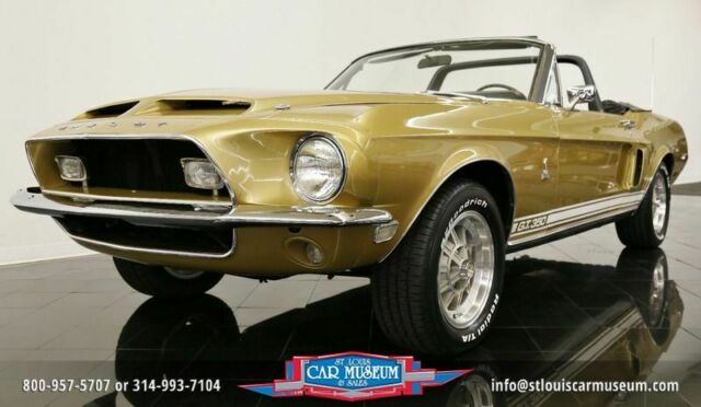 The 1968 Shelby Mustang Cobra GT350; One of only 404 Shelby GT350 Convertibles ever built! One of only 82 in Sunlit Gold over Black interior! Optioned with numbers matching 302ci V8, 4-speed transmission, power disc brakes, power steering, power top, 10-spoke alloy wheels, tilt-away steering column and more! Great example for Shelby enthusiasts and Mustang collectors alike! 1968 Shelby Mustang Cobra GT350 Background: Shelby production was taken in-house under Ford control by 1968. This change allowed for more insight and...development from the Ford execs in the production process. This also meant a few design changes that production year. The front end saw the intake scoops pushed out to the edge with twist hood locks, and the addition of rear positioned hood louvers. The grill was now highlighted in trim with rectangle Marchal or Lucas fog lamps still positioned there. The GT350 would now receive the 302ci V8 fitted with an oval Cobra air cleaner, Cobra aluminum intake with Holley 600cfm carburetion, highlighted by Cobra valve covers. Output would be rated at a respectable 250 horsepower. It would by a hot seller with 1,657 units built, but only 404 would be convertibles! 1968 Shelby Mustang Cobra GT350 Info: We are pleased to have the opportunity to represent this 1968 Shelby Mustang Cobra GT350 convertible finished in its factory ordered color of Sunlit Gold Metallic over Deluxe Black vinyl interior with White folding convertible top. Under thehood lies the original, numbers correct 302ci V8 engine mated to the factory 4-speed manual transmission and 3.89:1 rear axle ratio. Options on this example include power disc brakes, power steering, power glass backlite convertible top, extra cooling package, wheel lip moldings, original Marchal fog lamps, Tilt-away steering wheel, heavy duty battery, tachometer & trip odometer, Visibility Group, Philco AM radio, padded roll bar, shoulder harnesses (now absent), Cobra lap belts front & rear, Interior Dcor Group, rear splash guards, 15 aluminum Shelby 10-spoke wheels, and Stewart Warner console gauges for oil pressure & amperage. Our 1968 Shelby Mustang Cobra GT350 was special order #2747 coming from Larry Lange Ford Inc based in Cedar Falls, IA. It was scheduled for build on March 19th, 1968, but came in ahead of schedule being delivered on March 12th that year. Its early life is unknown, but the car lived out it retirement years in Phoenix, Arizona with title records from 2003 to date. It remained wonderfully original with exception to an older exterior repaint that today would be best described as very glossy and vibrant, but showing few touch ups here and there. We suspect the top had been replaced at that same time years ago. The interior remained 100riginal upon arrival to the St. Louis Car Museum with the seat foams growing tired, and the seat upholstery seams pulling away in the normal areas. In July of 2016, the entire interior was restored with brand new carpet, complete seating upholstery & foams, along with a brand new glass backlite convertible top & boot cover. The interior center console received a new, correct Cobra embossed armrest pad, shifter boot, chrome trim bezel, along with fresh wood veneer. We further elected to replace all four tires with new BF Goodrich Radial T/A white letter tires, the fuel sending unit, coolant temp sensor, and sway bay links & bushings. The previous owners had already recently added four new shocks, new mufflers, oil pan gasket, and a fresh fuel pump. Today, the odometer shows 99,473 which we feel very confident is original, but without excellent records, we are selling the vehicle mileage exempt. As for the originality, we found the engine stamp pad to read 8T173042, while our vehicle number would be 8T183042. In our professional assessment having reviewed a number of vehicle stamps over the years, finding seven of eight numbers to match, particularly the final 4 digits in this case, we are comfortably stating this is the born-with engine this car delivered new with. Quite possibly an error on the assembly line during production. The block itself is further stamped with 8B9 on the front also indicating a correct 1968 production date with Cobra intake S2MS-9424A fitted with proper Holley S8MS-9510C/ List 4234 carburetor. The top loader transmission maintains factory inspection markings and tag stamped RUG N1 representing a correct 28-spine close ratio unit for a small block application. All in all, we have zero doubt this is a 100umbers matching and code correct example. We invite any questions. Please call to schedule an inspection.