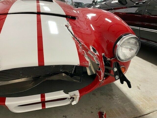 Factory Five Shelby Cobra Kit Car with just 2,150 miles. The car sustained minor damage when the parking brake was not set. Complete parts for repair including nose panel are about $3,200. I can provide the estimate to interested buyers. Radiator sustained some damage and the car has not been driven since the accident. The radiator needs to be fixed prior to driving it. The accident happened in our warehouse. The damage is contained to the driver side front of the nose, I have included several detailed pictures. The car rolled into a concrete barrier with no driver in the car. The car has a clean Utah title in our possession. I have the full build book to be included with the sale. I am a licensed dealer in Utah. Utah buyers will be required to pay sales tax, out of state buyer do not. I can assist with shipping quotes, but shipping is the responsibility of the buyer. Please reach out with any questions. Damage photos are included. |
