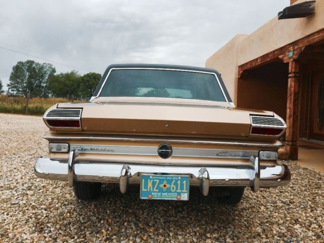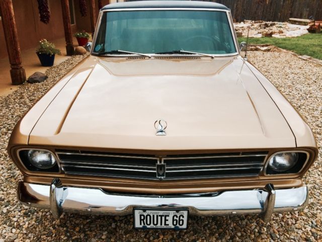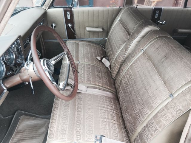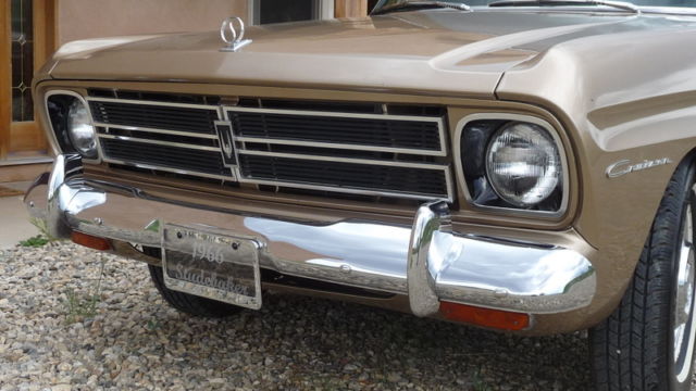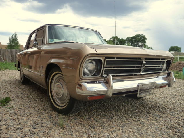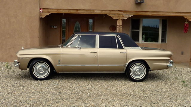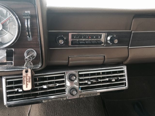 This is an excellent example of Studebaker's top of the line model for 1966, he Cruiser. Cruisers featured 4 doors, n ultra luxurious interior and a vinyl top. Studebaker's manufactured their cars in their Canadian plant for the last two model years. The power plants were Canadian built GM engines which were both durable and reliable. This car's engine is original, ut it's automatic transmission has been replaced with a modern GM 4 speed automatic for better gas mileage and performance. The interior is all original except for the floor carpets. As you can see from the photos it's in fantastic shape. The only flaws are the plastic chrome trim on the door panels has worn off and the sun visor retainer clips are broken. I have new ones in the glove box. The plastic chrome trim can be covered with chrome tape. I tried doing this but it needs better adhesive than the standard built in adhesive. This car has cold, orking factory air conditioning with the Studebaker logo. The radio is original but has added FM hidden inside its chassis. Turning the power button off and on again toggles between AM and FM but the radio appears original on the screen. The tires are radial with high tread and are in excellent shape. I was able to purchase 4 brand new old stock correct wheel covers 2 years ago which are on the car. The originals are in the trunk. The car starts, uns and drives like a modern car. It has power steering. The power brakes were replaced with modern Turner disk brakes. Everything works except the clock. This was a California car for most of its life and was bought by a Studebaker parts dealer in Arizona before being sold to me. This car had tinted windows and was always garaged. The original gold paint was repainted in clear coat and is very glossy. Chrome is in near perfect condition. From occasional daily use, here are several very tiny imperfections, ll of which would not show up on a photo and can only be seen from very close up in person. This is not a concourse trailered car, ut could definitely be shown in local shows or club shows and take some trophies. As a weekly driver, his car excels. It attracts attention and comments whenever I drive it. My reason for selling it is that I moved to a smaller dwelling with only one covered parking place. When winter comes I will need that spot for my daily driver. Feel free to contact me for further information or extra photos if you wish. Buyer will have to arrange shipping at buyer's cost or pick up locally. I will assist in any way I can. Payment by secured funds, ashier's check, r to be arranged between buyer and seller. NO personal checks. Note: The distinctive Studebaker S hood ornament broke off as I was cleaning the car for sale. I ordered a new one and it is in the glove box.