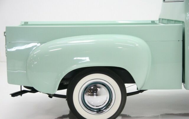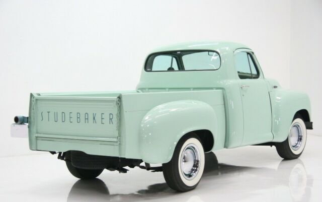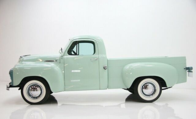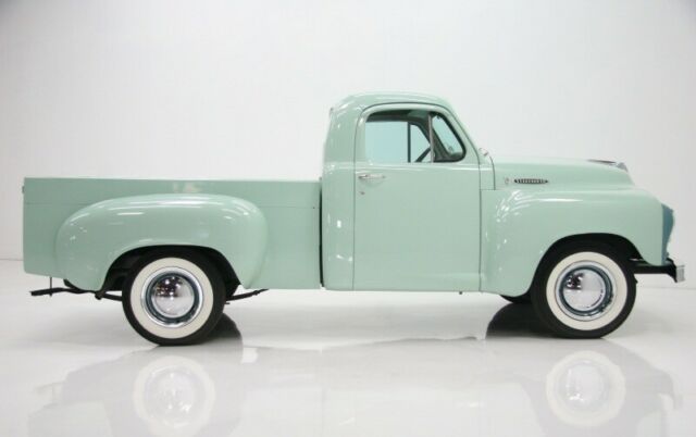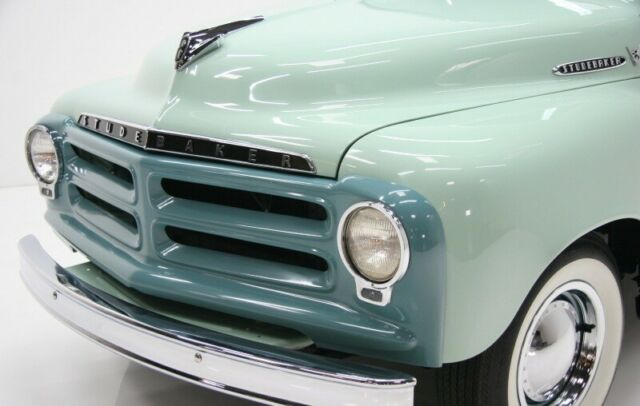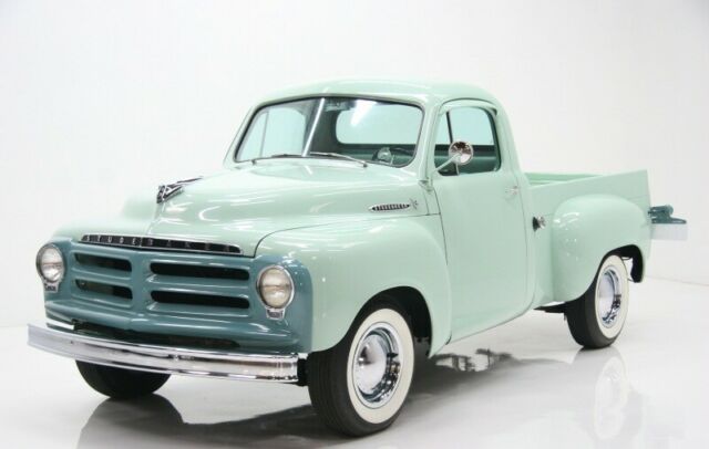 | This beautifully restored turquoise on turquoise and beige 1955 Studebaker E series Short Box Pick up features: 224cid 140hp V8, rust fre, Chrome Grill, side mirrors, 3-speed manual column shift transmission, and though we have no documentation to substantiate it-it is claimed to have 56,8K original miles. |