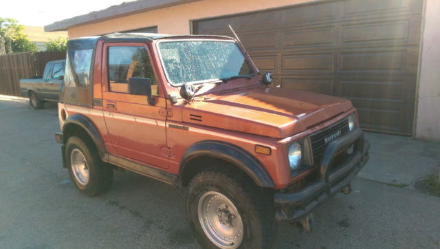 1987 Suzuki Samurai 4x4 5 speed manual transmission good running conditions. Very fun to drive comes with aluminum centerline wheels with the spare as well also has a reese tow hitch, oft top is in good conditions comes with an external gas tank mounted in the rear. Car is 20+ years old so its not perfect has minor cosmetics that need repair driver side mirror glass is broken also glove compartment latch is broken but overall a complete running samurai all original. Car is rust free samurai is located in California and is titled in Nevada clean title. Car is sold as is buyer is responsible for pickup. Feel free to ask as many questions.