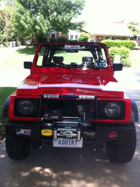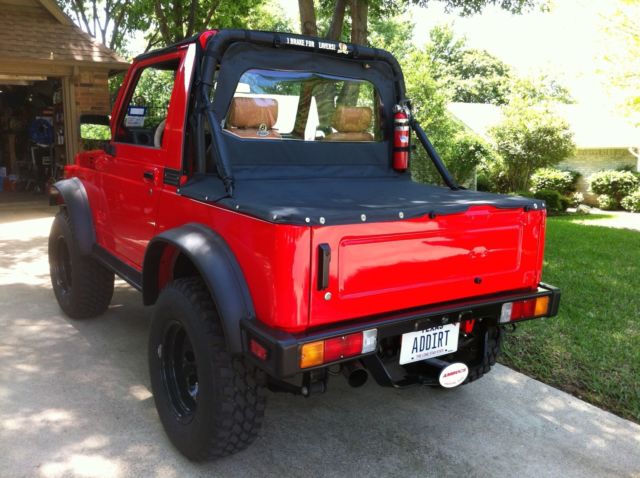 Exceptional 1987 Suzuki Samurai JX Convertible. Custom Grille and Bumper with an 8000 Lb. Winch. Ferrari Red Paint with Tan Leather Seats. The Front Seat Cushions are Real Hair-On Lambskin. All Interior Panels, including the Tailgate, are Aluminum Diamond Plate. Sony AM /FM Cd Player with MP3 Jack and Removable Face Plate. This Samurai has a 3.5 Inch Calmini Spring Lift and includes a Full Top, Bikini Top, Windjammer, and a Tonneau Cover. This Samurai spent a good part of it's life beingtowed behind a motorhome, therefore the actual driven mileage is unknown. Everything works and it does not smoke or knock. Clear Texas Title in hand. Please ask any questions prior to bidding. A Deposit of $1,000.00 due within 48 hours of sale and full payment within 7 days, verified cashier's check or cash in person. The buyer isresponsible for vehicle pickup or shipping. Thisvehicle is for sale locally and I reserve the right to end the auction early if it sells.
