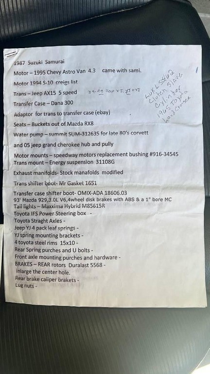 1997 Suzuki Samurai This heavily modified 1997 Suzuki Samurai features a custom off-road build with a 4.3L V6 Chevy engine, 5-speed Toyota Land Cruiser transmission, Dana 60 axles, and a Dana 300 transfer case. Highlights include power bucket seats from a Mazda RX-8, fully updated electrical system, and 35-inch all-terrain tires with a matching spare. The vehicle is street legal, drives great at highway speeds, and comes with detailed documentation. A winch is included but requires a gearbox rebuild. No air conditioning currently, but space is available for install. Located in Hudson, FL 34667 For more information, please call 833-265-6113 and mention ID 20901 1997 Suzuki Samurai This heavily modified 1997 Suzuki Samurai features a custom off-road build with a 4.3L V6 Chevy engine, 5-speed Toyota Land Cruiser transmission, Dana 60 axles, and a Dana 300 transfer case. Highlights include power bucket seats from a Mazda RX-8, fully updated electrical system, and 35-inch all-terrain tires with a matching spare. The vehicle is street legal, drives great at highway speeds, and comes with detailed documentation. A winch is included but requires a gearbox rebuild. No air conditioning currently, but space is available for install. Located in Hudson, FL 34667 For more information, please call 833-265-6113 and mention ID 20901 |
