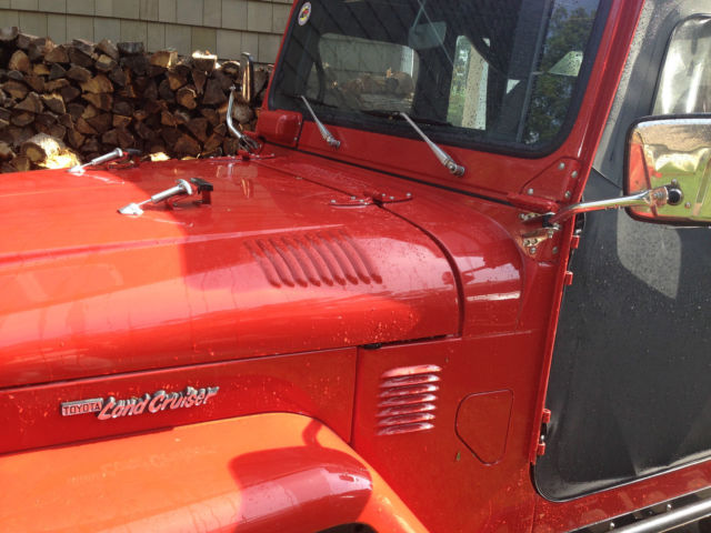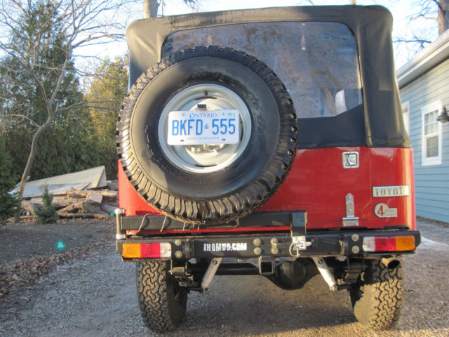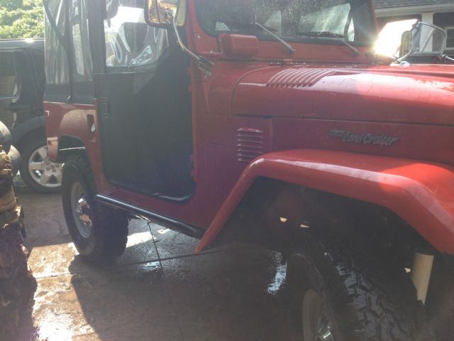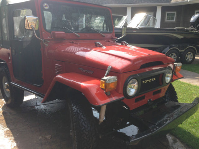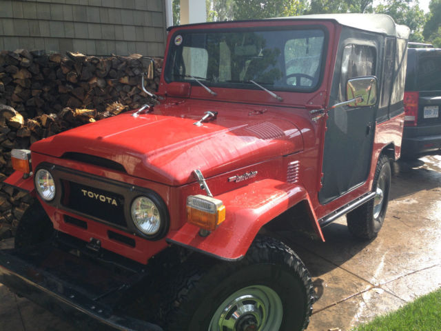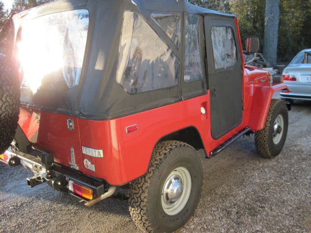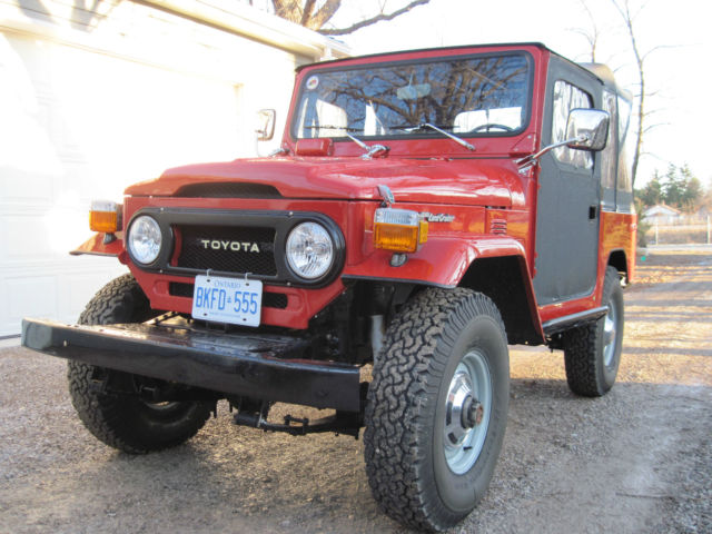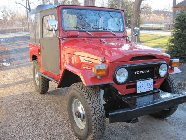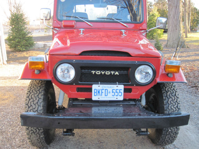 This FJ-40 is the nicest example you will see! She is a convertible with a rag top and full doors, lso has a tonneau cover with 1/2 doors. The engine, ransmission and transfer case were professionally rebuilt. This truck had a full body off restoration and is perfect in every way. No expense was spared and had $40K spent on the restoration. The odometer shows 18,000 and has a few up-grades to augment the original look. The floors are finished with Rhino Liner, ff road stereo box, oll cage, tereo with amp and sub, tainless exhaust and headers, ock sliders, pare bracket/ rear bumper with hitch and sits on Goodyear 33's. Everything works perfect and runs amazing. Stored inside and has not seen any off road anything even rain since restoration. The truck is in Windsor, ntario and can be imported to the US by owner and current owners cost landed in Detroit. If the successful buyer is in Canada the truck will be fully certified and ready to license. Can assist with shipping. Beautiful FJ!!