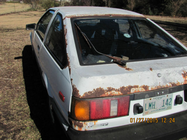 | Car was bought new by myself in November 1983. Almost all miles are highway miles. Maintenance was kept up to date until I quit driving it. Has rust in various places mostly on the hatchback. This was a factory defect. Most of the car is sound. AC compressor removed. Weber Carb installed. Exhaust needs replacement. Gas tank has rust and I suspect fuel line partially plugged. Had gas tank out about a year ago and cleaned but rust was prevalent and as earlier revealed I believe the fuel line is plugged and will need to be replaced. This car would make a project car for the Toyota enthusiast. It is a fairly rare model due to rear wheel drive and the hatchback. That's all I can remember right now. Has been a great car for me.This site would not accept the VIN - IT IS - JT2AE8600E0020660 - Shipping I am not sure about. I assume you come an get it. Otherwise maybe possible. |