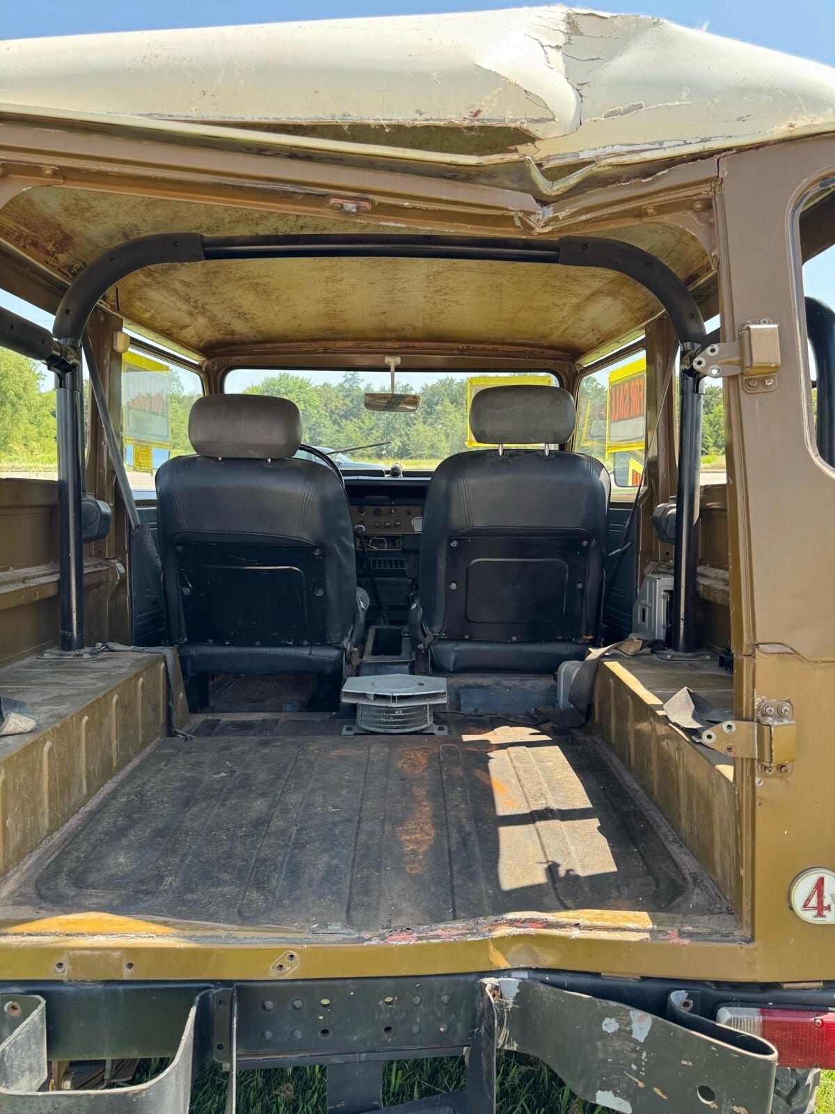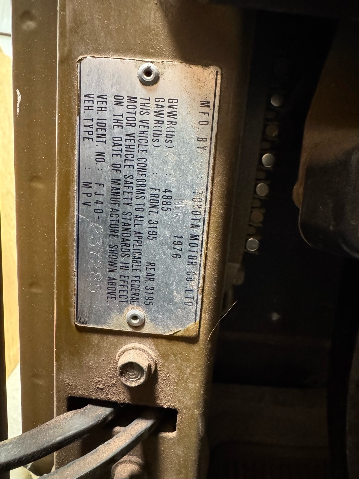 1977 Toyota FJ40 Land Cruiser Vehicle Details 1977 Toyota FJ40 Land Cruiser. Original stock 2F engine, 4sp transmission, 2sp transfer case. Factory P.T.O. winch. DUI HEI distributor. Runs & drives. Has nice towbar & magnetic tow lights included. Has aftermarket O.M.E. lifted springs & shocks. Truck has rear damage & is being sold “ as is”. It has a salvage title that is pending from insurance company. Have documents to verify this. If this is a problem, please don’t bid. It is due in a few weeks. We have the glass, spare tire carrier & miscellaneous other parts that were removed to inspect damage. |