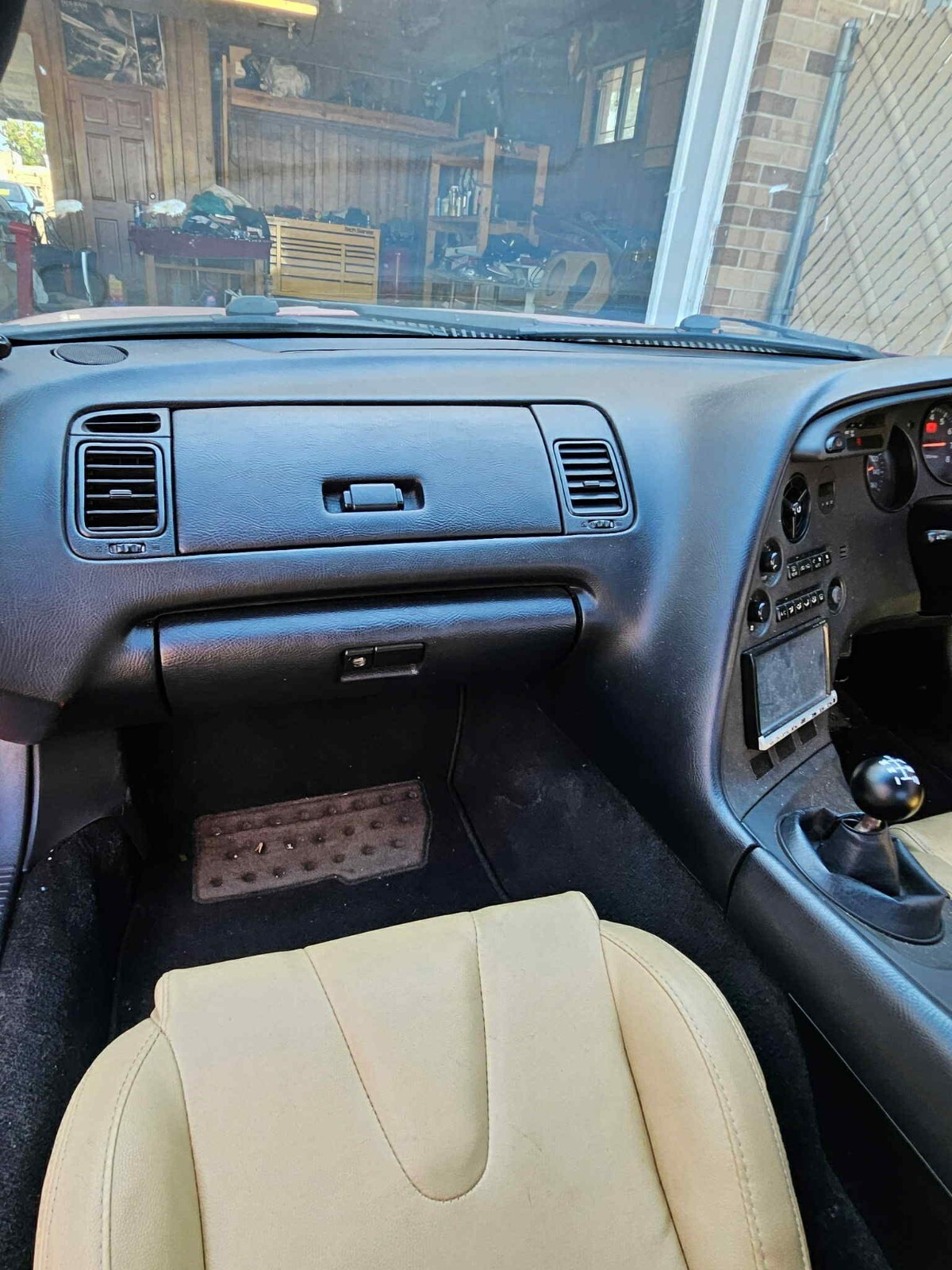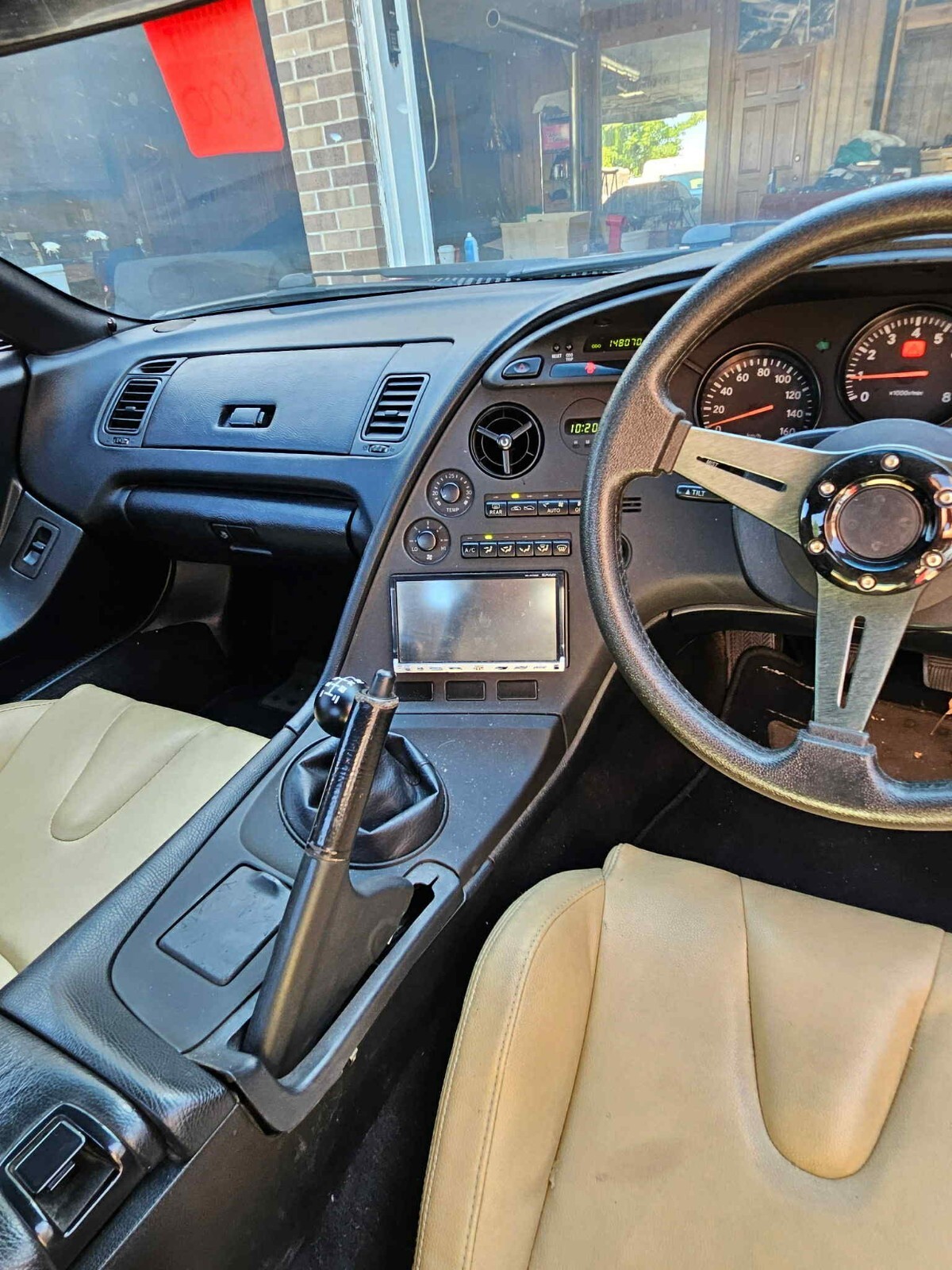 This Supra features a 5-speed manual transmission. This is a right-hand drive, Japanese-spec coupe that's currently titled in New Mexico. It's equipped with a metric instrument cluster, and the odometer currently shows about 145,000 kilometers, or approximately 95,500 miles. Factory equipment on this Supra includes an anti-lock brake system, a rear window wiper, a rear spoiler, integrated projector fog lights, power windows and door locks, automatic climate control, a rear defogger, and a digital clock. Modifications reported by the seller include 18-inch wheels, an aftermarket exhaust system, an aftermarket engine air intake, orange instrument trim, an aftermarket shift knob, a Pioneer Carrozzeria head unit, and window tint. Launched in Japan in 1993, the fourth-generation Supra was celebrated as one of Toyota's best sports cars even before it earned a starring role in the Fast & Furious franchise. It offered performance that rivaled much more expensive cars and the reliability expected from a Toyota. Production ended in 2002, and the nameplate was consigned to the automotive attic until the BMW-based model arrived in 2019. Power comes from a 2JZ-GE 3.0-liter straight-6, rated at about 220 horsepower and 210 lb-ft of torque. It spins the rear wheels via a 5-speed manual transmission. Equipment