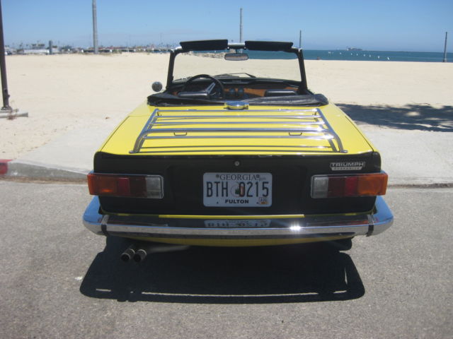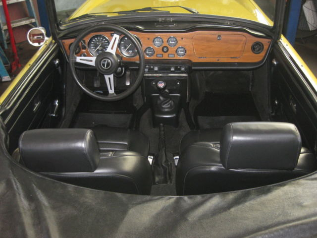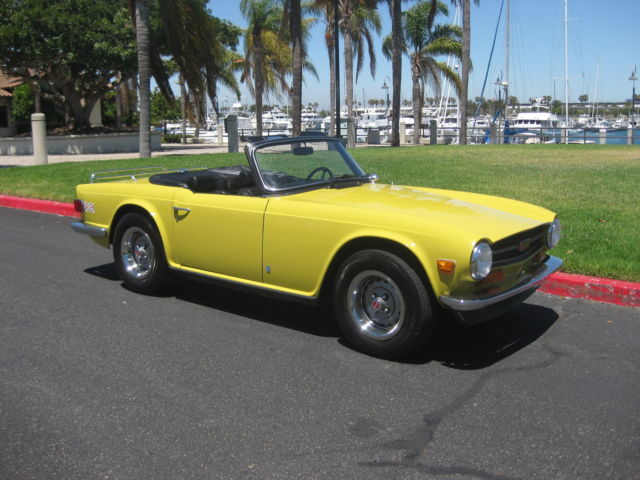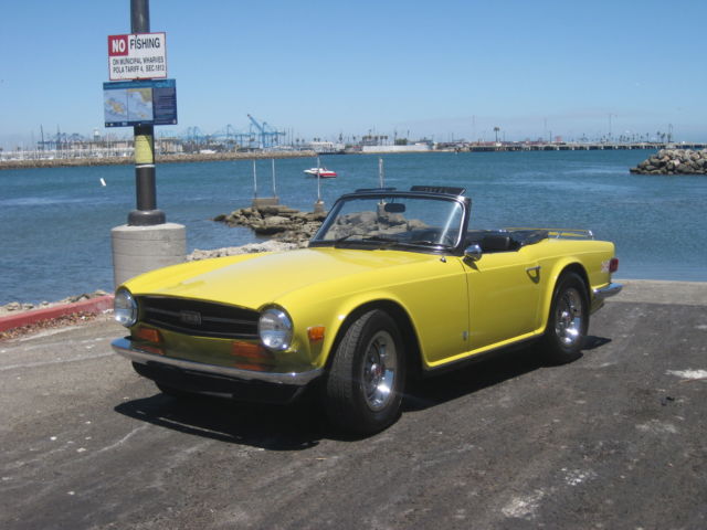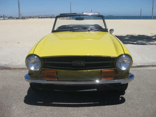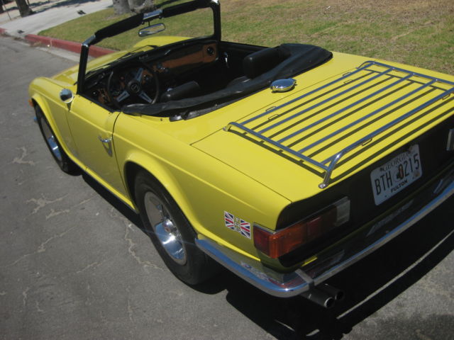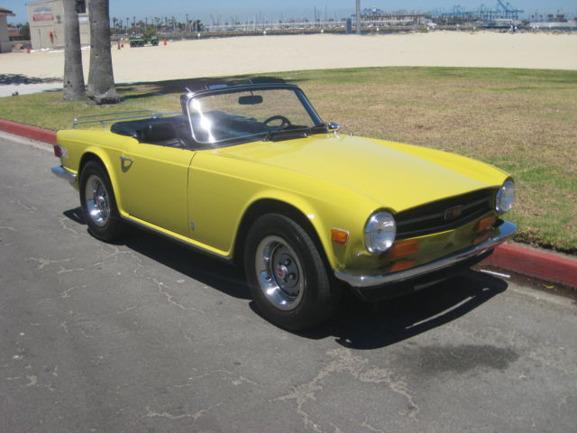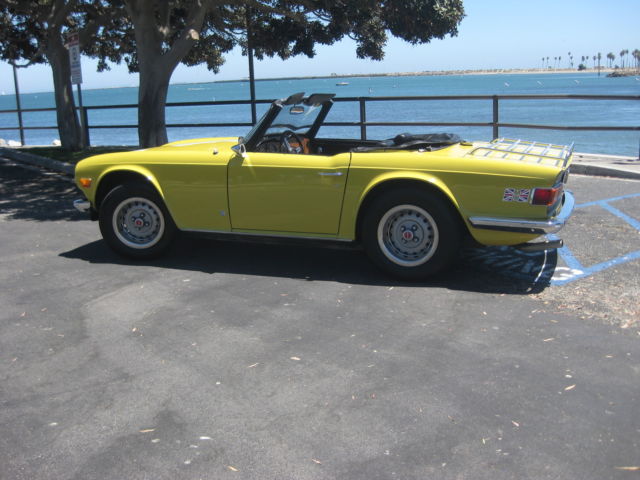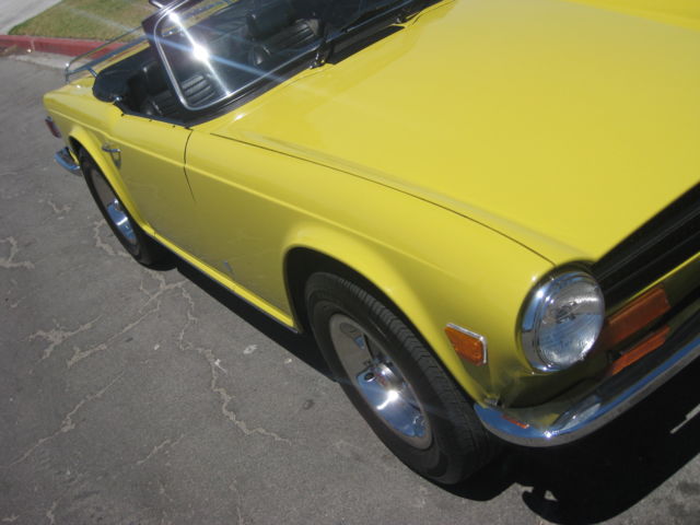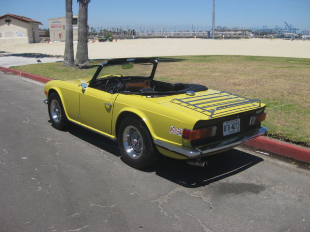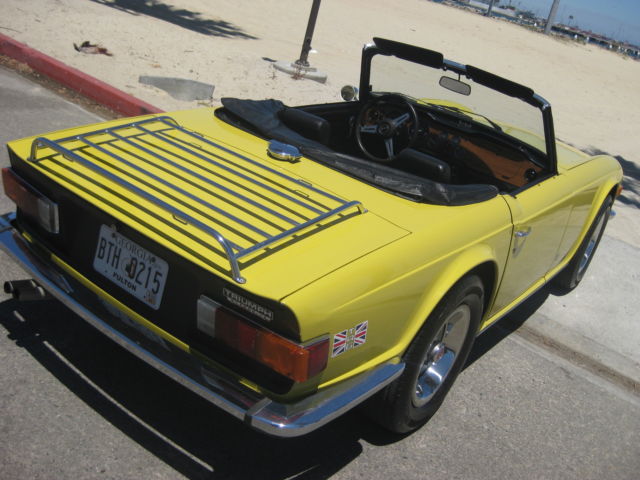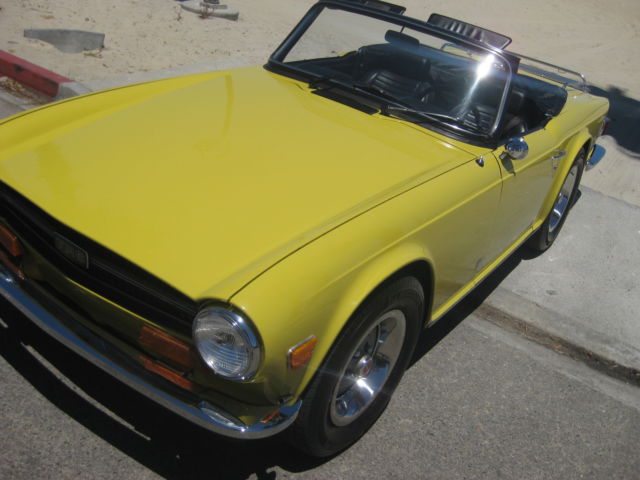 Thisauction is for an excellent driving, ery original, otally rust free, ery complete, R6. Being an original overdrive car makes this a very desirable vehicle. Looking around this car there is absolutely no evidence of it ever having been in an accident. All area's inside the fenders front and back, here you expect to find the odd ripple or missing hardware, re amazingly straight and correct. The floors and underbody are dry, ndamaged and rust free. It has a very nice deep shine and only a few tiny stone chips, n the front. This car has no rust and never has had any rust repairs that I can see. The doors close nicely and the panel fit is excellent for one of these cars. Chrome is in very good condition it really sparkles in the sun. The windshield has a few small chips and one about larger one in the lower center area but it is not very noticeable when driving. Originally a good solid, ery straight California car ( its orig plates are included and are in the trunk) it was sold to a British car specialist in Canada and over a couple of years was treated to a complete bare metal repaint with good quality base-clearcoat in the original Mimosa Yellow. The paint under the hood is still the original factory paint and the color match is perfect. The interior was re-done with all new panels, eat kits, arpet etc. The convertible top was replaced with a top quality Robbins item, hich is still in very good shape. The rubber seals look like were also replaced at this time. Mechanically it was completely gone through as well, aving had the following work; Engine, Completely rebuilt cylinder head using new guides and satellite valves. New rings and crank bearings along with afresh oil pump and spin on oil filter conversion. Drive train, Resealed differential, ompletely overhauled transmission and overdrive, ew clutch. Suspension, All new bushings front and rear along with tie rod ends and front ball joints. On top of this the car was thoroughly gone over and any issues were taken care of at that time. Since then it has covered about 5 thousand miles. Always garaged and never driven in harsh conditions. I drive a lot of these cars and this is honestly one of the nicest TR6's I have driven. It starts easily from cold on the choke and warms up with no fuss or drivability issues. It does not overheat or run-on when turned off. The engine is very smooth and quiet, ore powerful than most and has good oil pressure. There is no sign of any smoke from the exhaust and has a very even idle. The clutch is exceptionally smooth as is the transmission. The gears fall easily to hand with no grinding and the overdrive works very well dropping in firmly. The diff is quiet and there is none of the common clunking from the rear drive shafts. This aspect of the car helps to make it such a pleasure to drive. The brakes feel good, ull the car up straight with no drama or squealing and the handbrake works well. The suspension is supple and has no unwanted knocks or bonks and the steering light and precise. The wheel is straight and the indicators self cancel. From the cockpit the dash is in very good shape looks to be original and has some small chips around the glovebox door. All the gauges and electrical items work correctly. The seats adjust as they are supposed to and there is a useful emergency hood release on the passenger side if needed. There is a very slight rattle on occasion from the passenger door, t sounds like the glass, ut other than that it has an unusually tight feel to it. The car is currently registered in Georgia as the owner has residency there. It is back in CA now after making the drive down from Canada last month. Underneath there are the usual signs of small oil leaks but overall quite dry for one of these cars. Other small flaws are that the front spoiler has a small scrape on the right front and has broken around the mounting bolt on that side. A few of the plastic snaps on the convertible top cover need to be replaced, he rear bumper chrome is showing it's age and there are some marks on the bottom of rocker panel at the right front where a careless mechanic has used a jack. Mechanically I would probably suggest changing the cooling hoses as a precaution although not leaking they look a bit on the older side. The only other thing that I can find wrong with it is that the leather gear knob is starting to get a little loose! It sits on a set of 205-70 x15 Michelin tyres with only a few thousand miles on them — they were changed after the current owner purchased the car. It also comes with a convenient cockpit cover to keep the heat and dust out when parked. To recap this car is an excellent daily driver that looks great and drives extremely well. It has been very well maintained by its fastidious current owner. It will keep appreciating due to its accident free body and originality. It would even probably score well in a local show. As always I would recommend viewing or driving this car if at all possible, lease call 310 833 1525 for an appointment. Bid to buy with confidence, y descriptions tend to be a little harsh so, he car will not disappoint. We have sold many British Cars on e-bay, ll buyers leavingexcellent feedback.