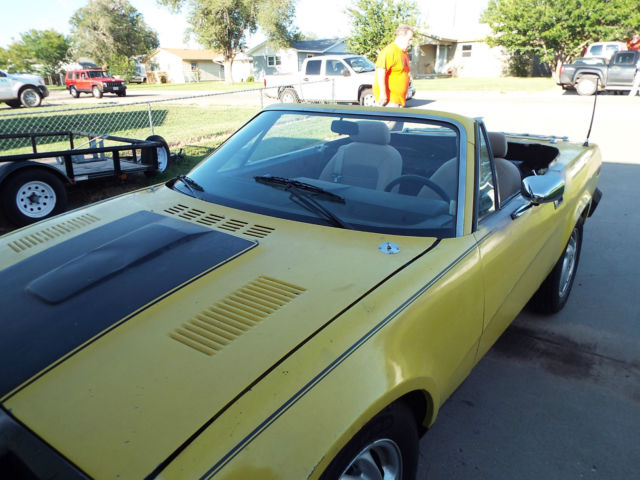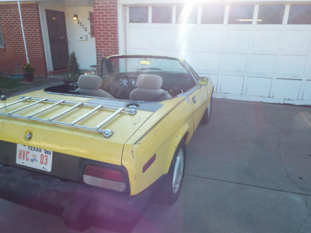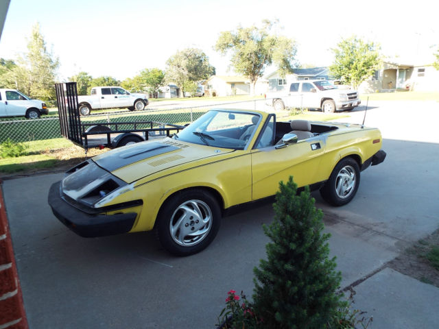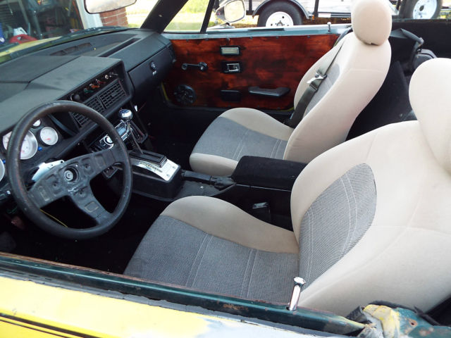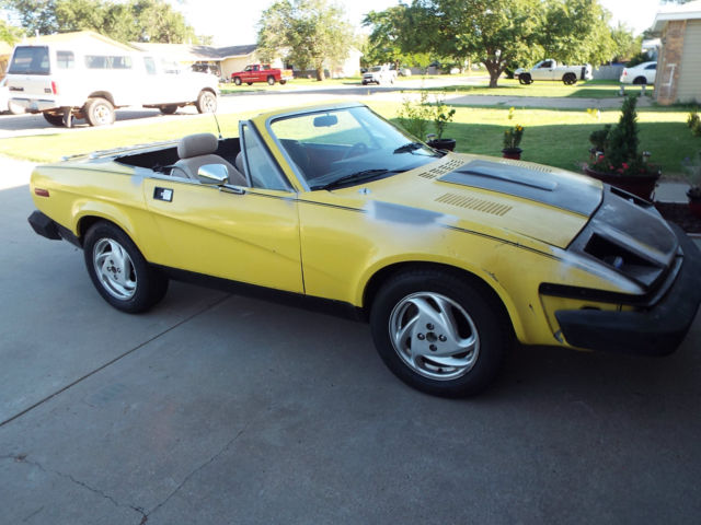 I began this project several years ago. I bought a TR-7 that needed a new engine and a lot of other work, so we decided on the Buick V-6 conversion. The "donor" car was a 1984 Buick LeSabre with the "big" 4.1 V-6 and the 2004R transmission. The engine was rebuilt/reconditioned with new valve job, rings, crankshaft & rod bearings, gaskets, etc. The transmission was serviced before installation in the TR-7. The car has the following NEW parts or components, B & M shifter, AOD kit/lockout switch, Aluminium fuel cell, Edelbrock performer carb ( to eliminate to GM computer controlled carb), custom headers from John's Cars, glass pack mufflers, aluminum radiator, transmission cooler, electric cooling fan, front brake rotors, pads and rebuilt calipers, speedometer, tach, oil, fuel, volt, water temp gauges, new British Leyland turn signal switch, radio and speakers, tires, wheel adapters (from the small 4 x 95mm pattern to a standard 4 x 100mm pattern) and ball joints and tie rod ends. There's no doubt other new parts, but that's the bulk of it. The rack and pinion was disassembled, cleaned, checked for wear, reassembled and adjusted. The original pop up headlights have been removed and replaced with driving/fog lights. I was going to make a Lexan covers to conceal the lights. The original screwed up wiring harness was removed and the car was rewired to eliminate the crummy wiring, The original seats were replaced with non Triumph seats and new carpet was cut to fit. The 15" wheels are from a Ford Escort. I have the convertible top frame, but it is not installed. The top was rotten, but we have the other associated parts and trim. The bad, it has a small leak somewhere from the transmission or cooler lines. I don't where the leak is, but suspect the cooler lines. The shifter needs adjustment to the safety switch, starter works fine in neutral, but not every time in park. The GOOD is that this car starts right up every time, is fun to drive and is at a good point to make that "hot rod" or just reliable driver with the TR-7 style for someone to finish. My intent was always to make that car you could take out for a cruise or drive, but I've got too many projects not complete!! I do have a video showing a walk around of the car that I wanted to "show" the "mean" sounding V-6, but all you hear is the Texas wind blowing in the background! There is a walk around of the car on Youtube at https://youtu.be/D_IVpbm_BLY. It shows the car and I was trying to capture the "sound" but too much wind!!
