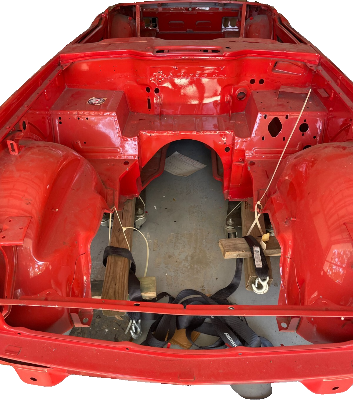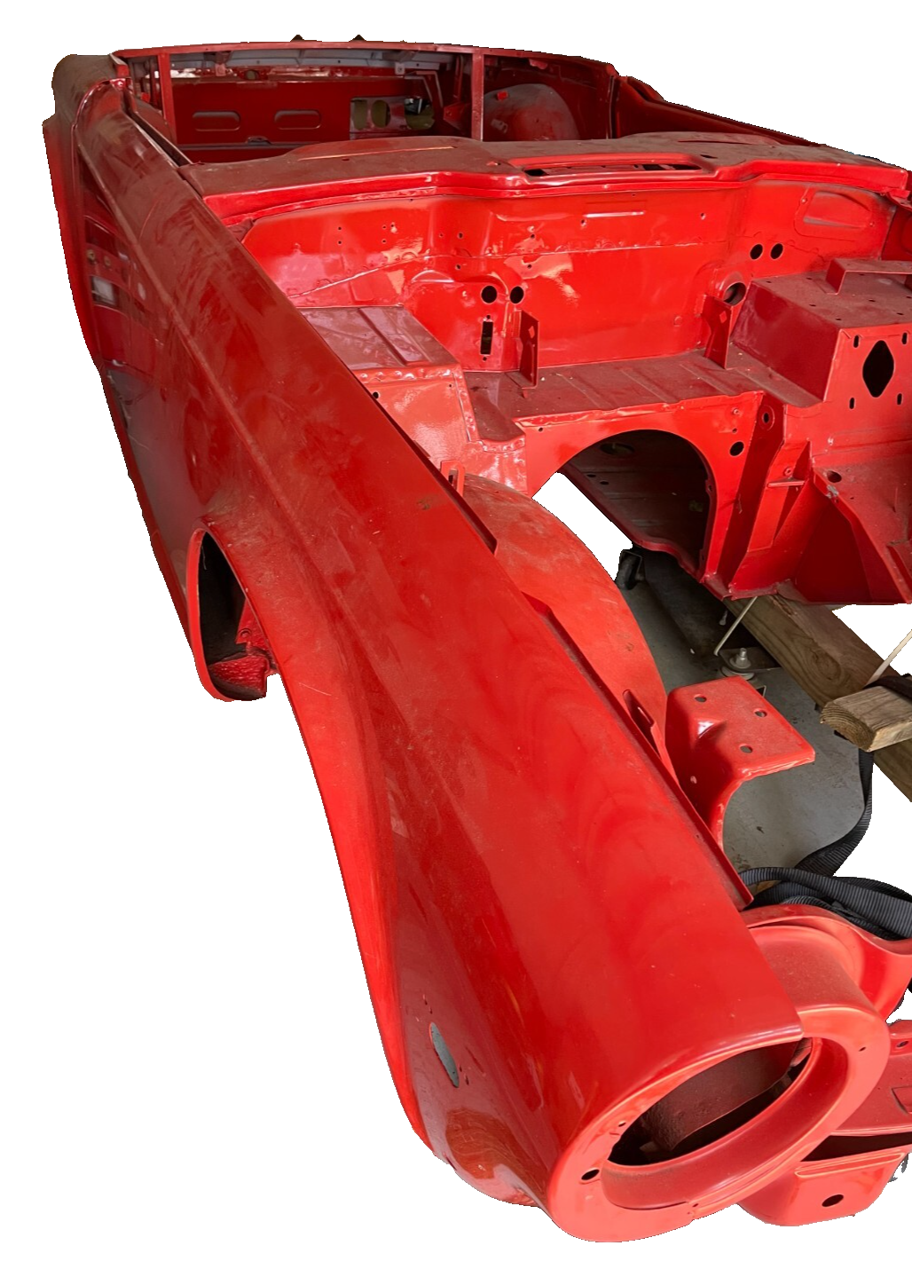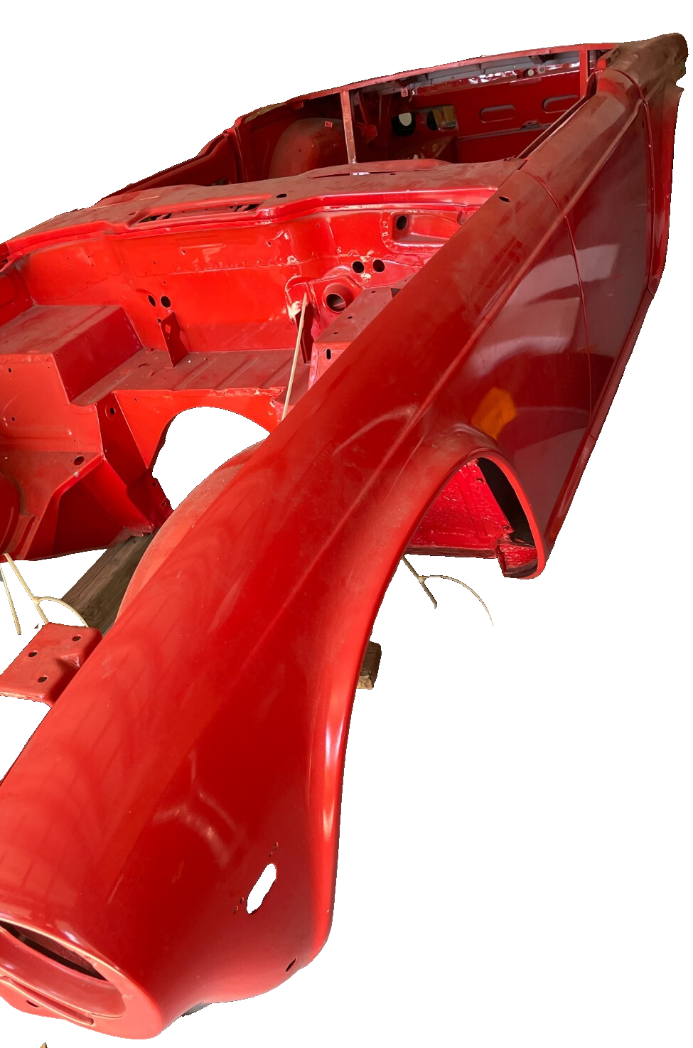 1974 Triumph TR6 - Body Shell and Chassis Plus Hood, Deck Lid, and Windscreen, Correct VIN tag on Windscreen. Frame off Restoration Refurbished Body Shell with Hood and Trunk Lid - Media Blasted, White Epoxy Primer, Base Coat Clear Coat - Sprayed with Dupont Pimento Color Repairs Performed - Replaced Right Front Wheel Arch, Bulkhead, Floor Pans, all Replaced panels were NOS Red Oxide Primed panels. Refurbished Chassis - Blasted, Green Epoxy Primer - Sprayed with Corrosion Resistant Black Sealer Body is NOT mounted to the Chassis