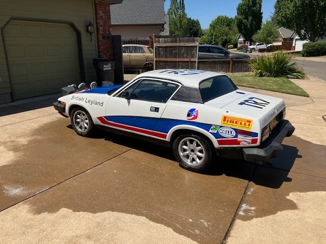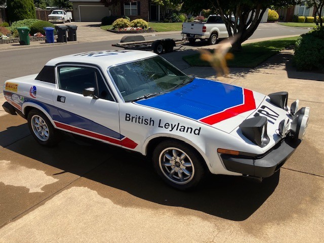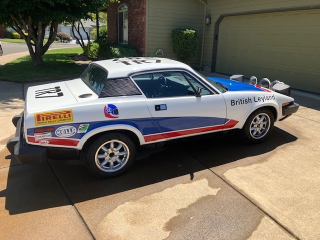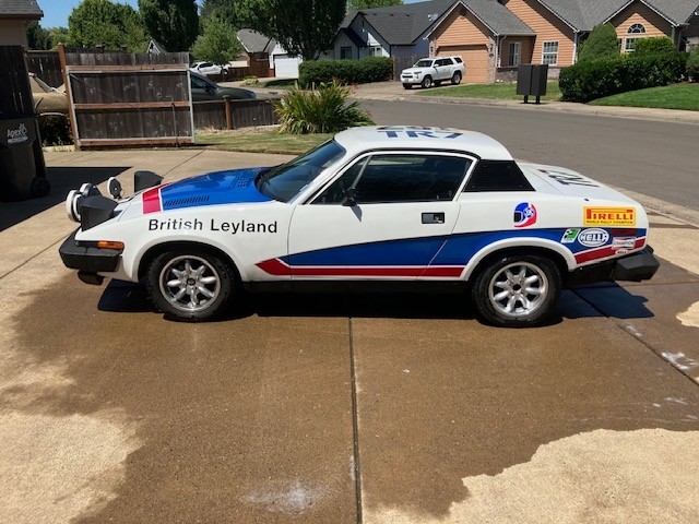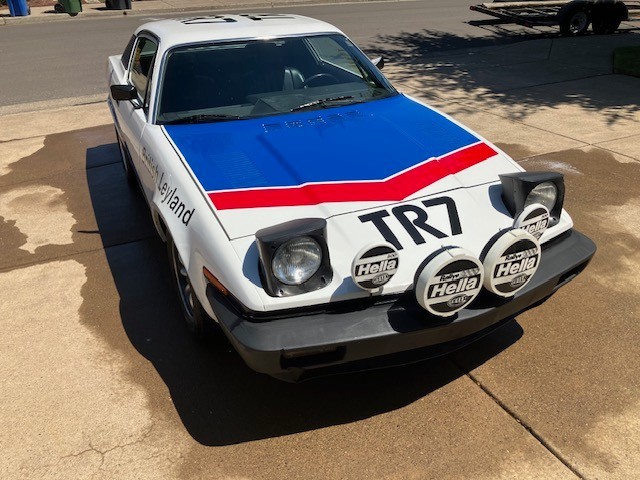 The 1977 Triumph TR7 is a classic car with a sleek black interior design, and seating for 2. This model features 2 doors and is known for its unique and stylish design as "The shape of things to come." With its Triumph make and clean vehicle title, this vintage car is sure to appeal to collectors and enthusiasts of classic cars. Car painted to match factory rally livery. Features include: Rebuilt motor and carburetors, air conditioning, 5 speed transmission, minilite wheels (including spare), recent seat covers and door panels, spin on oil filter, working Hella Rally lights, adjustable SPAX struts and shocks. Things that need attention include: Heater core not plumbed, rubber floor matts instead of carpet, paint damage around passenger front wheel well. Sale includes Haynes manual and some extra parts. Car is a hoot to drive and always turns heads.