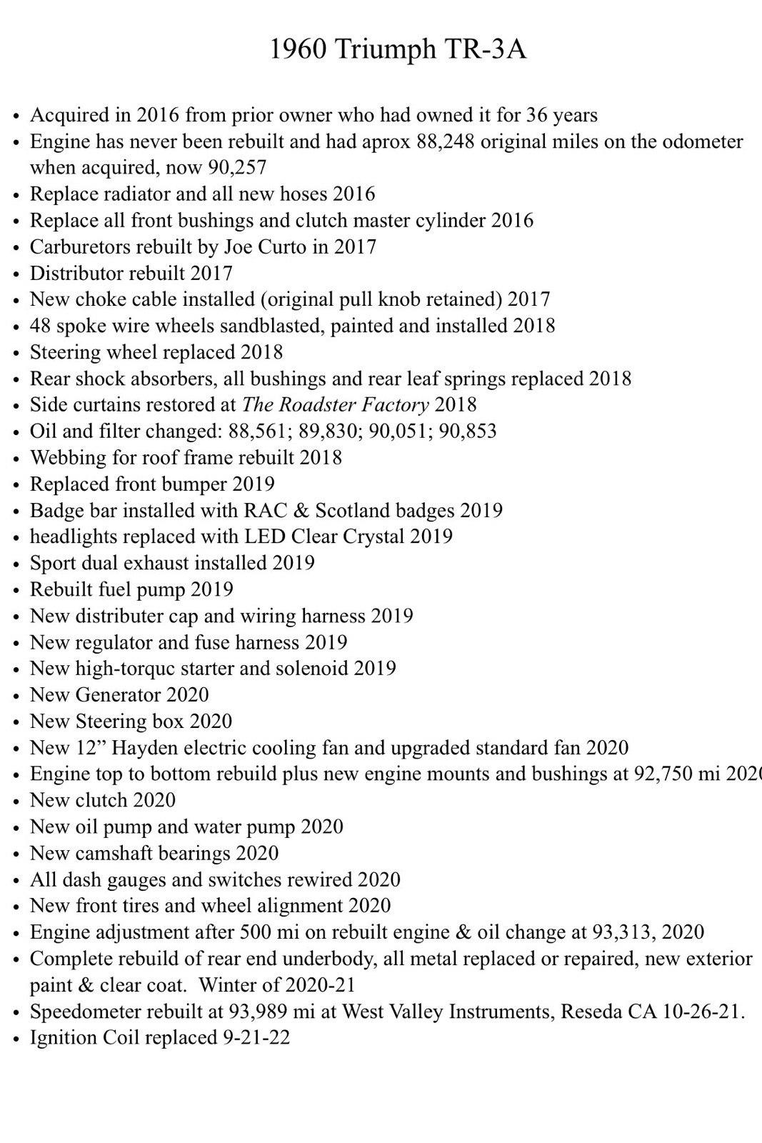 This 1960 Triumph TR 3 is a restored vehicle. The owner has had it for 5+ years. The vehicle runs great and is mainly used for weekend drives. Vehicle Details 1960 TR-3A |