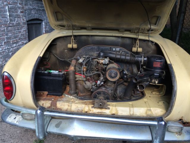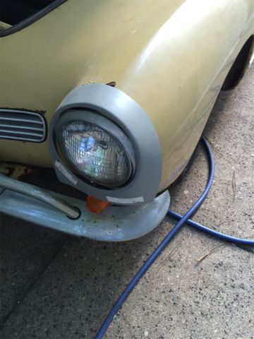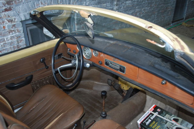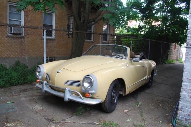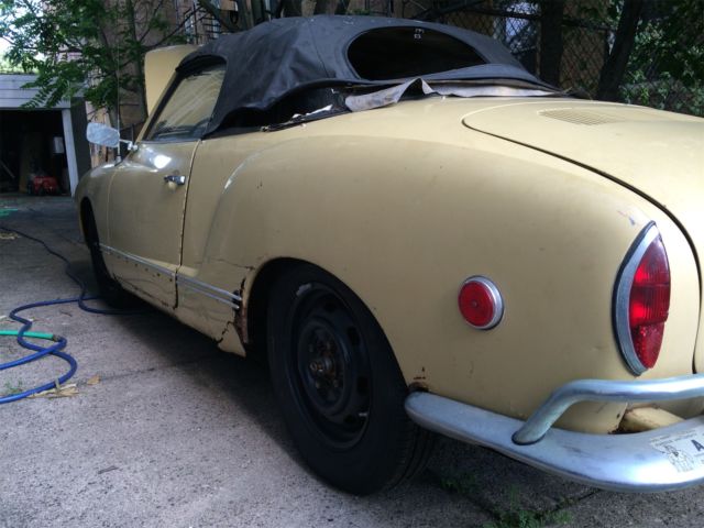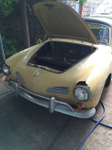 Selling a rare 1969 1/2 VW Convertible Karmann Ghia that was made between design changes. It was the first year of the independent rear suspension (IRS) and the real glass rear window, nd these came only in ate 1969s. It was also the last year for the 1960s tail light design, ngine and bumpers. Bought from estate a few years ago, riole Yellow. Good: original paint/engine/interior/roof/glass. Revamped brake system, ew front/rear disc brakes/new steel and rubber lines. New front (adjustable) beam, pindles, teering dampener, eplaced battery, ires, hocks, leaned out and cored gas tank. Have spare rear glass with defroster lines...as well as original that has no defrost lines but is clear glass (possibly earliest version of the 69.5). Garaged in Brooklyn NY, ill coordinate with your shipper. Original brown interior. No sag in floors. Engine tuned on a dime..starts immediately even after months idle. Clear title (transferable registration for NYS). Will coordinate with your shipper. Bad (depending?): original paint/engine/interior/roof/glass. Needs new top (frame intact), nterior panels in rear seat area, ash. Rust in usual spaces..over headlights, round outer rockers, elow taillights, some under battery. Interior needs revamp. Passenger door scraped and I'm replacing the door handle. Missing trim on both sides. Ugly and tired but lovable...has clearly been a used daily driver for major chunk of its life. Nevertheless catches the cheering eye of people wherever we go. Will include sheet metal replacement for the rust above the headlights (see grey covers in photos), s well as the sheet metal for the rocker panels. An AS-IS sale. For purists or collectors looking for a rare year CV in between two design changes of the Karmann Ghia, his is a great little car. |