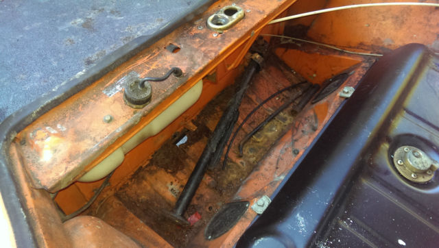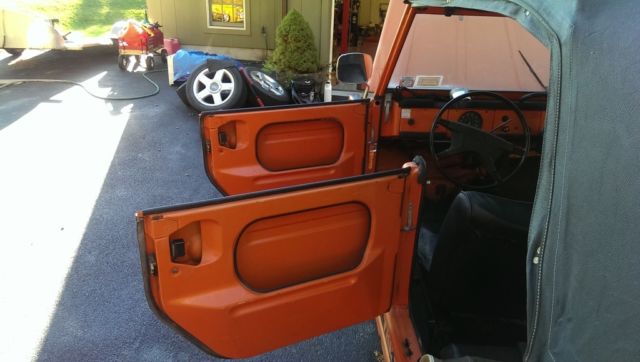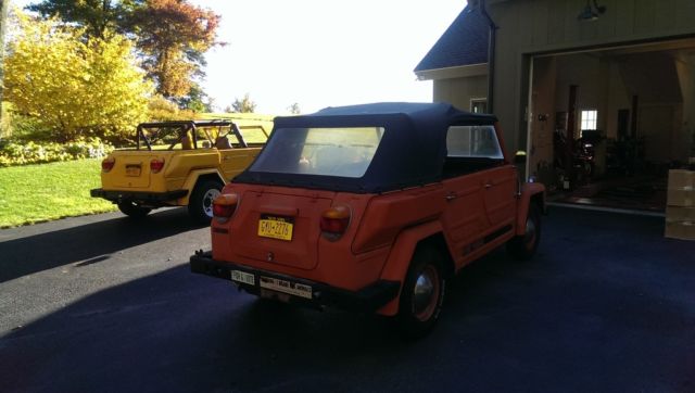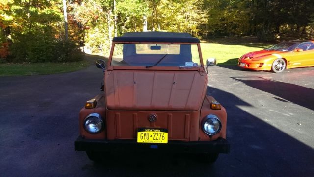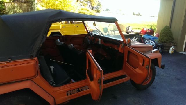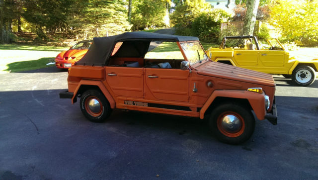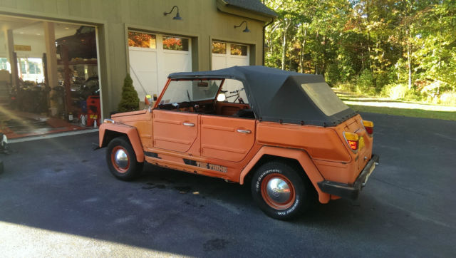 1974 Thing, rd Owner, lear Title, uns and Drives VW Thing ready for restoration. Floors are completely shot and the body is very rusty. I am the 3rd owner after my Uncle owned it 20+ years. Car was stored in West Hampton, Y for many years in a damp garage. It runs and drives well, ut the tires are old and out of round, o at 45 mph it shakes like crazy. An extra brake hub is included for easy balancing by a shop once new tires are installed. The sump was held on by bolts, ut I used aircooled.net repair studs and it holds oil fine and uses 100% Stock VW parts. The engine is original but the electric choke on the carb is broken. I will be including the original carb with a new EMPI 34 PICT-3 carb. I replaced the head gaskets on the original black covers and that has stopped Oil Leaking from there as well. The top is shot, nd the headliner is corroded. The Convertible bows will clean up well, nd work as thay should. Seats are original, nd will need recovering and stuffing. All the electric works like it should. There is a wiper motor, ut I do not think its original and it is on all the time. It may be the switch, am not sure. The wiper linkage can probably be saved but it will need new wiper arms and blades. I am including a 5 point show bar with padding as well as a bikini top and bows. The Show bar will not be installed, s I would not want to do that with the floors in the state they are in. Besides, f you are going to put new floors in, ou should weld in the show bar for more support. Since I have the car I put in a new gas tank which has been coated with Caswell tank liner and the fuel system runs clean. I have changed the oil and run 91 Ethanol Free through the fuel system. The car has adequate power. The Speedometer has been changed, nd there is a sticker on the dash showing that this was done at around 44K. I don't know actual mileage. These cars turn heads wherever they go, o matter the condition.