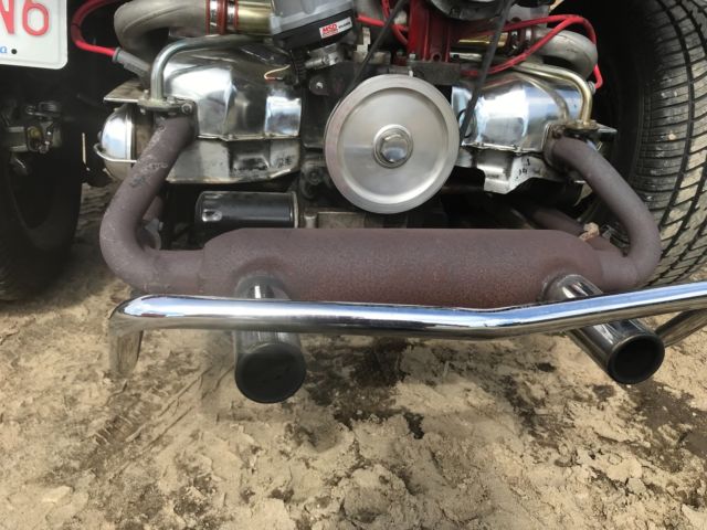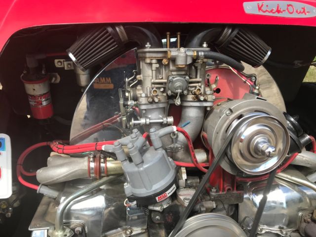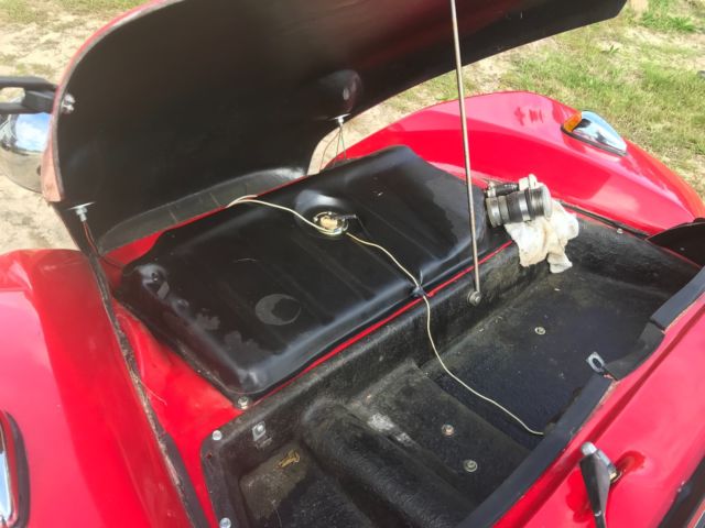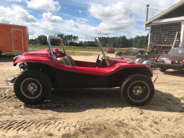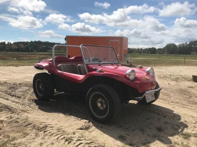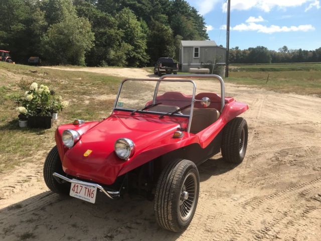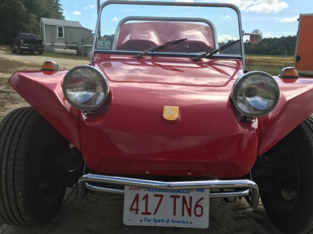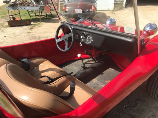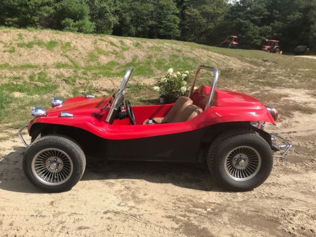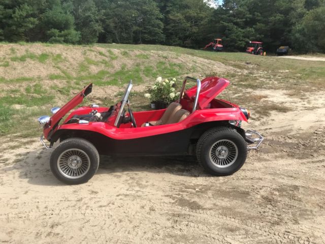 This is a Meyers Manx Traditional "Kick-Out, Dragon Red body, dune buggy sitting on a 1969 VW Beetle shorten pan. Just about everything on the car has been rebuild, engine, new dual weber carburetors, wiring, MSD digital ignition, MSD distributor, hydraulic disc brakes (best feature on the car), tan vinyl seats, which are locked back into place. The "Kick-Out" has shinny chrome roll bar and windshield, along with the light covers and bumpers. I also have a tan hard top for the car, never instlalled. Has about 5,200 miles on her since rebuild, kept inside, under a cover at all times. Beautiful car, always draws eyes when driving down the road. The only issue that the car has Is keeping a good ground, and this can affect the gas gauge level and sometimes the starter solenoid. But any ground issues never have been a show stopper. Willing to work with shipper, can be seen on appointment. Thank you, |